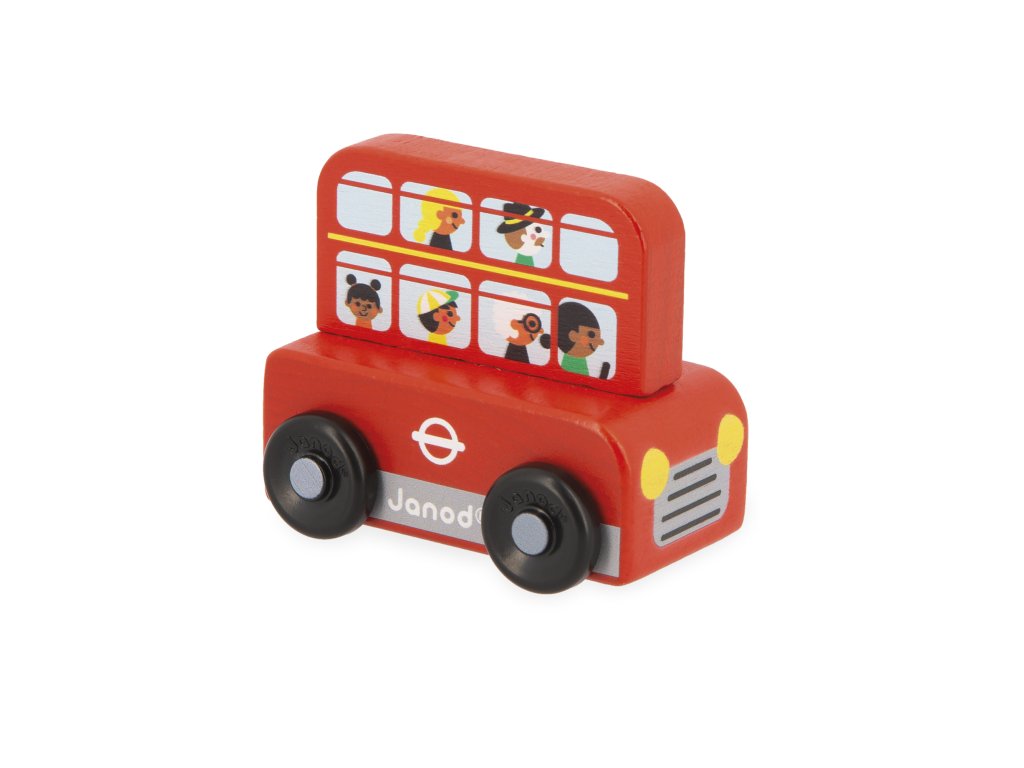 Vydajte sa na výlet do Veľkej Británie s týmito 4 rozkošnými zberateľskými vozidlami! Táto výstava obsahuje štyri vozidlá: červený dvojposchodový autobus plný turistov pripravených preskúmať mesto, londýnske taxi, policajné auto s policajtom v tradičnej britskej čiapke a malé zelené mestské auto so zábavným buldogom na palube! Tieto vozidlá sú špeciálne navrhnuté tak, aby sa s nimi malé rúčky ľahko manipulovalo. Ideálne na rozvoj jemnej motoriky a predstavivosti. Drevená hračka s certifikátom FSC™. Nie je možnosť výberu, cena za 1 kus.Pre deti od 12 mesiacov.