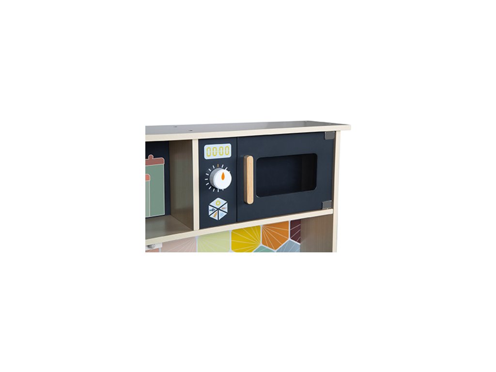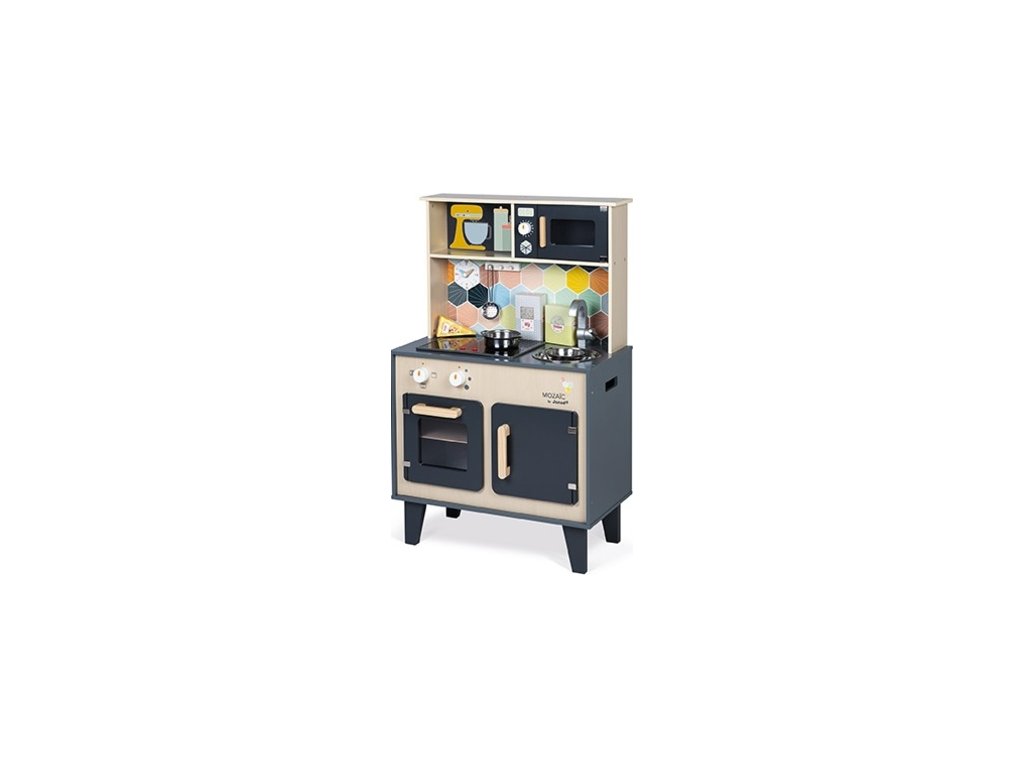 Veľká kuchynka Mozaic je vyrobená z dreva a má hák na náradie na zavesenie 1 naberačky, 1 hrnca a 1 kovového cedníka a 3 kartónových škatúľ na potraviny (syr, múka, ryža).