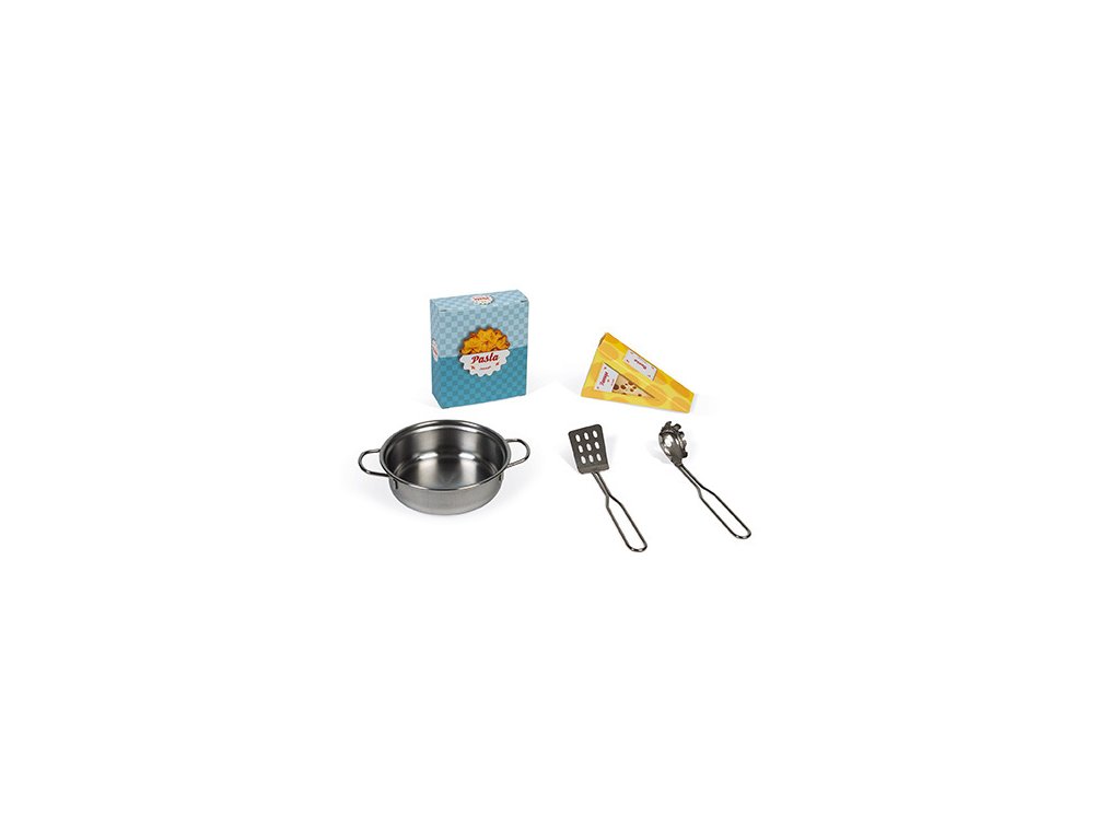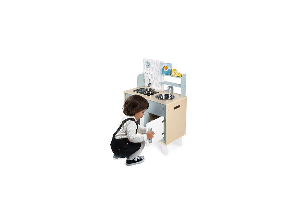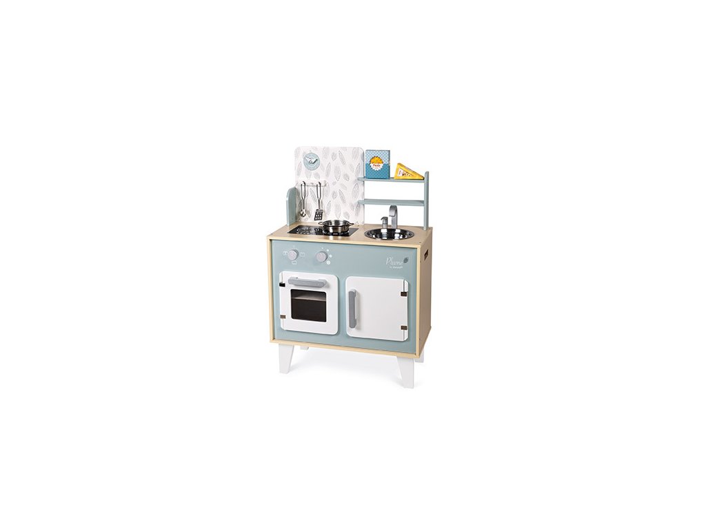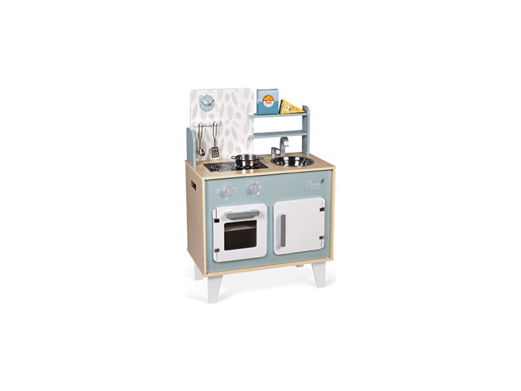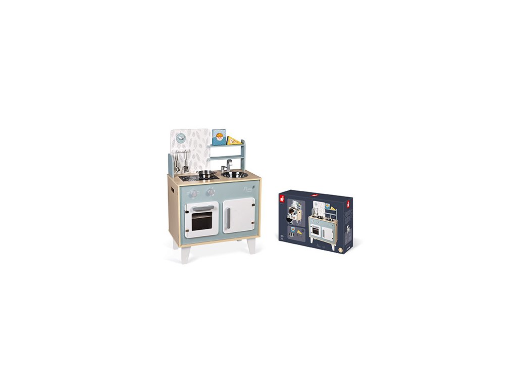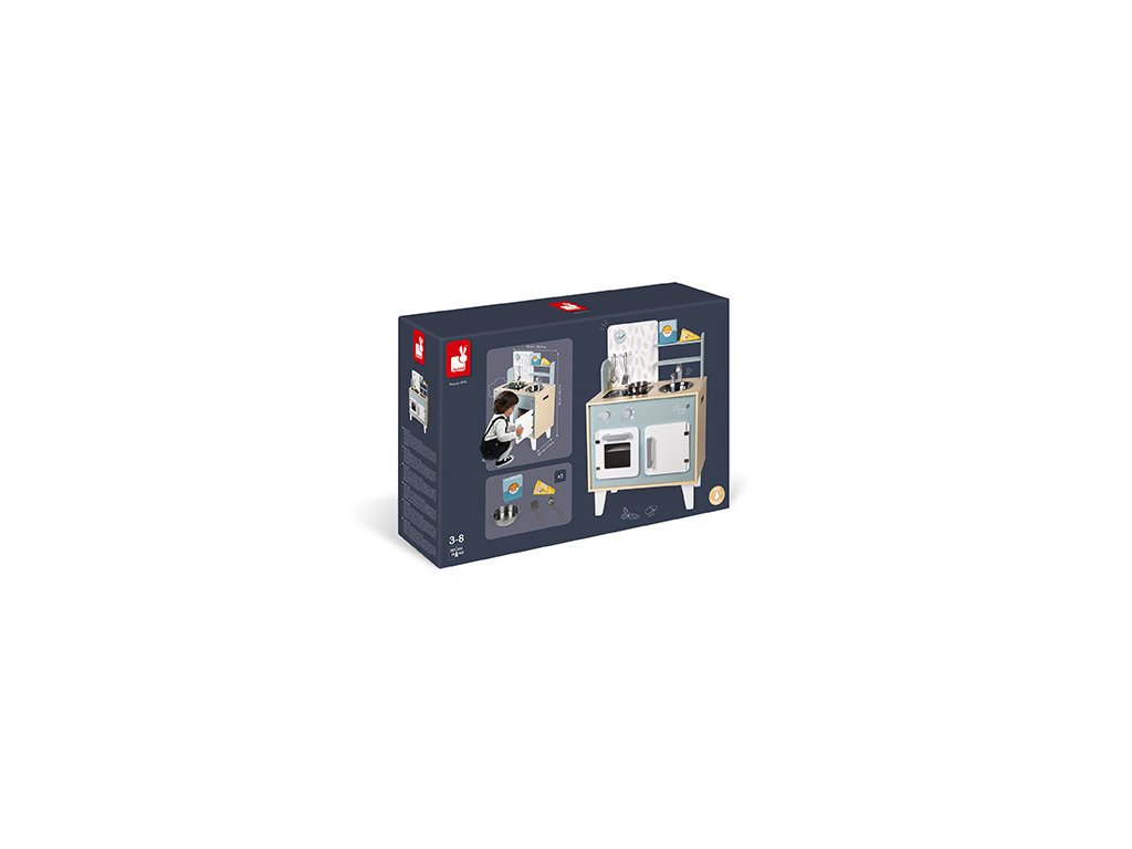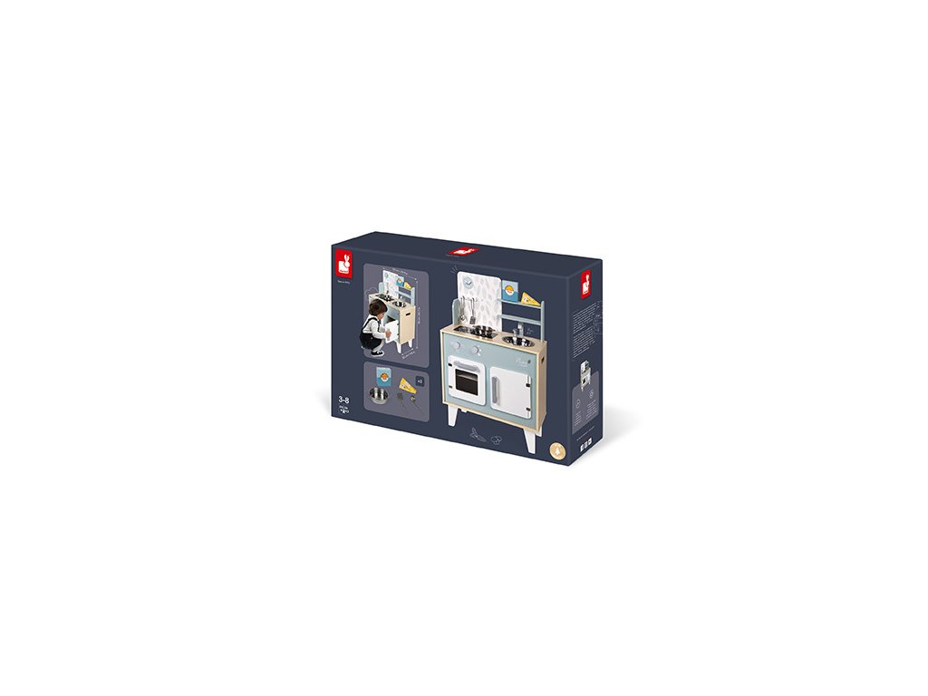 Aby sa z nich stali skvelí kuchári, táto kuchyňa vyrobená z prírodného dreva, dizajnovaná v modrej a sivej farbe je dodávaná s príslušenstvom, vrátane háčikov na zavesenie špagetovej naberačky a kovovej obracačky, kovového hrnca a 2 kartónových škatuliek s jedlom - cestoviny a syr.