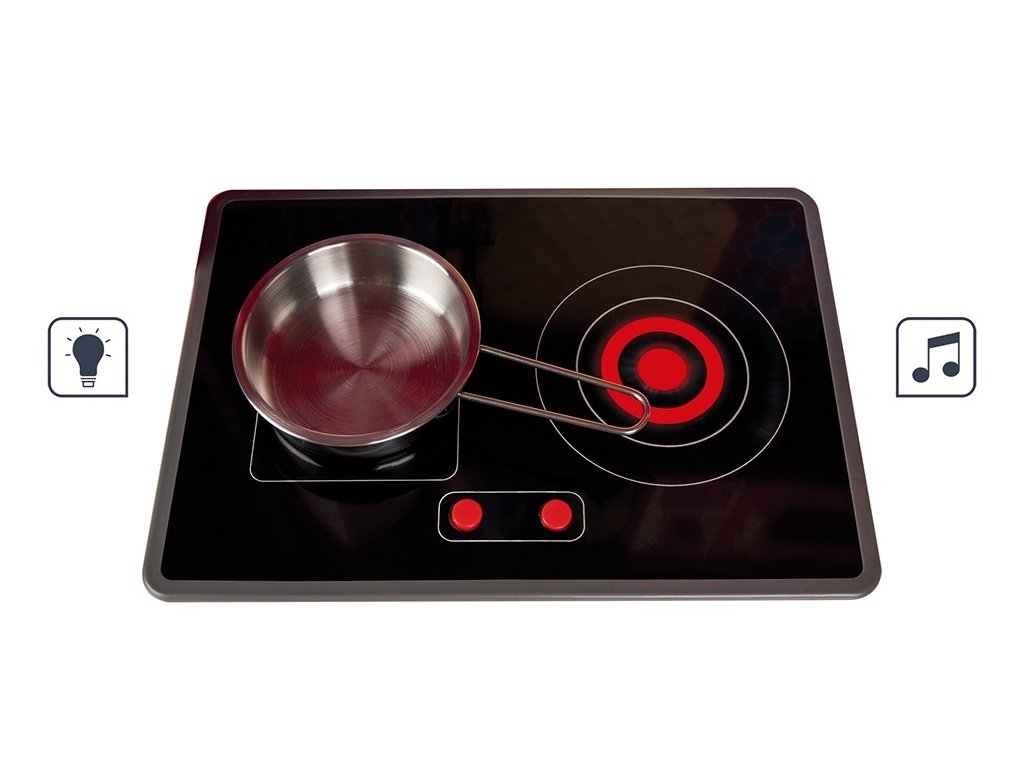 Varná doska svieti a vydáva zvuky ako v naozajstnej kuchynke. Varná platnička po zapnutí svieti ako skutočná.