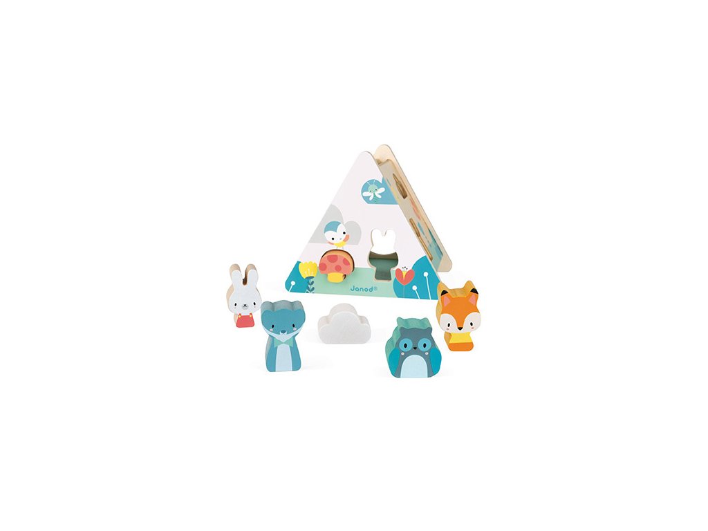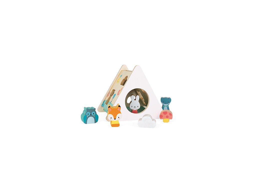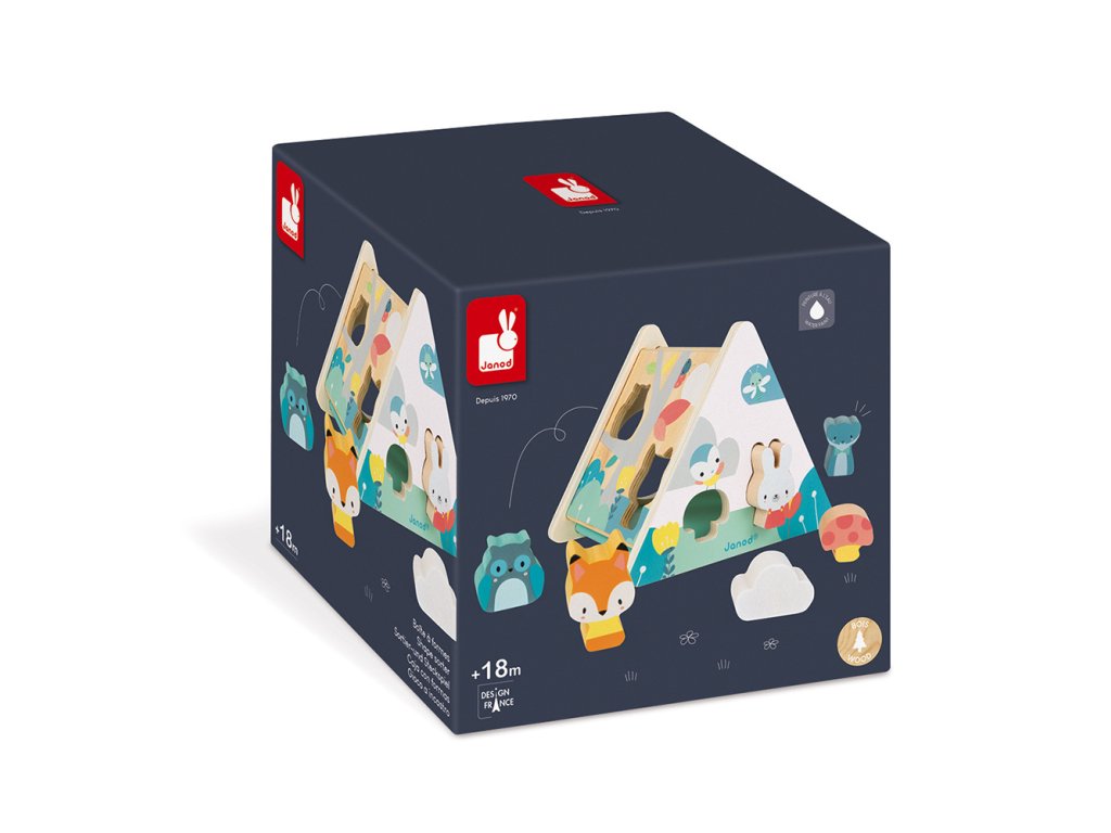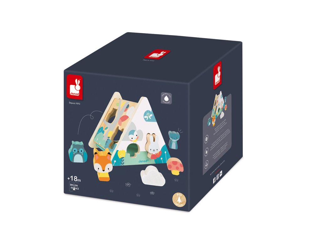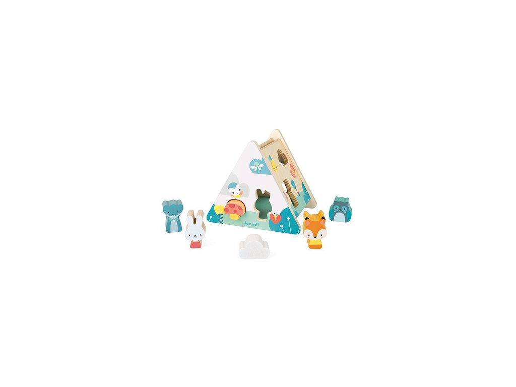 Nádherný pastelový drevený domček na vkladanie pre deti od 18 mesiacov. Predmety na vkladanie sú rozkošné štyri zvieratká, hríbik a obláčik, s nádhernými pastelovými farbami, ktoré sa detičkám zapáčia. Domček má na na troch stranách po dva otvory na vloženie tvarov. Na štvrtej strane je okrúhly veľký otvor, z ktoreho si detičky opäť môžu vybrať tvary späť. Prostredníctvom tejto hry si deti zlepšujú motorické schopnosti, koordináciu rúk a očí a spoznávajú tvary a farby. Rozmer : 15,2 x 18,2 x 16 cm Vhodné pre deti od 18 do 36 mesiacov