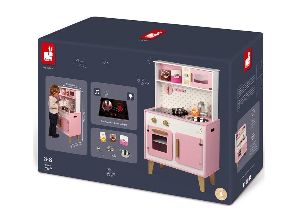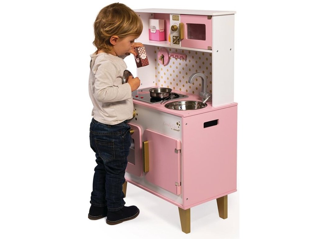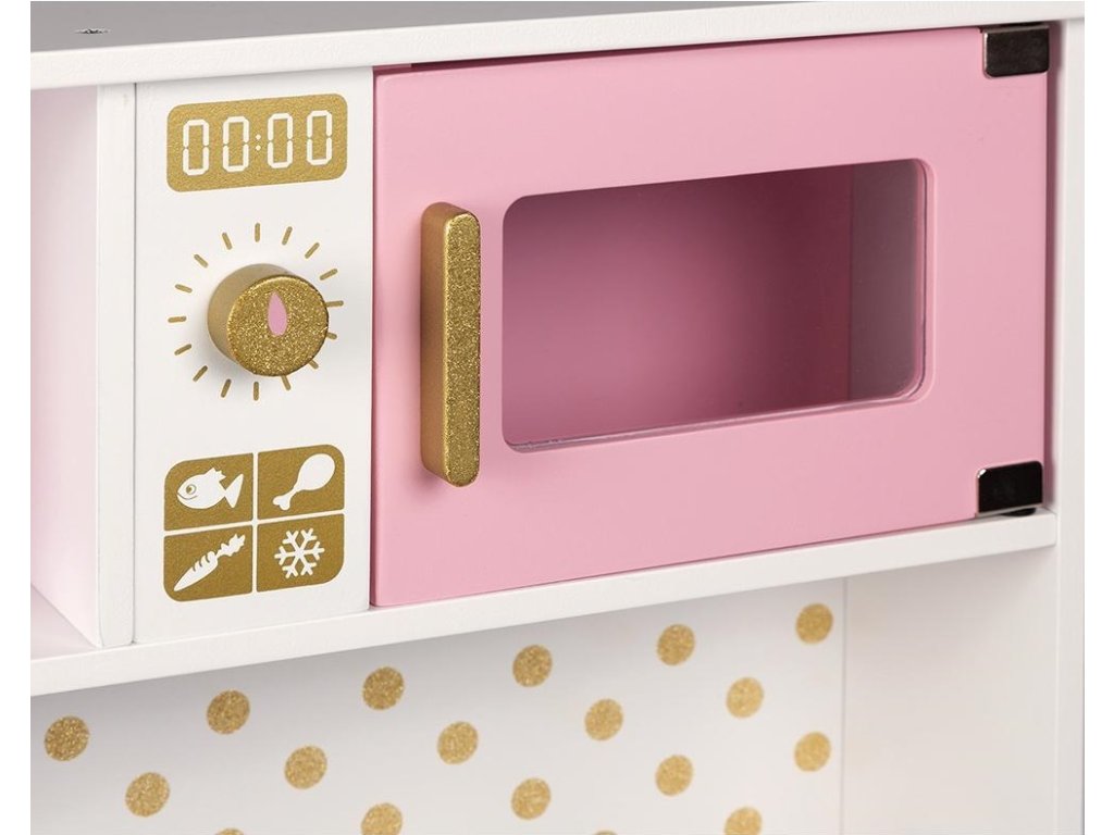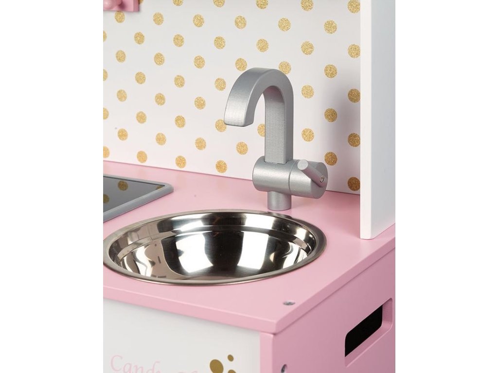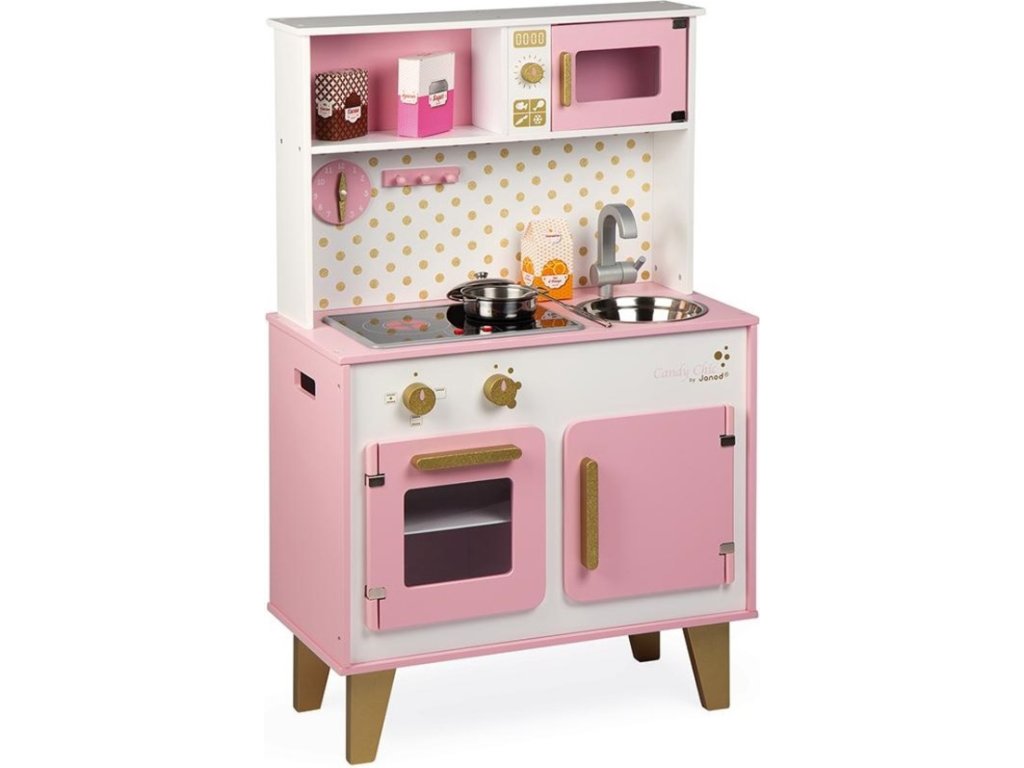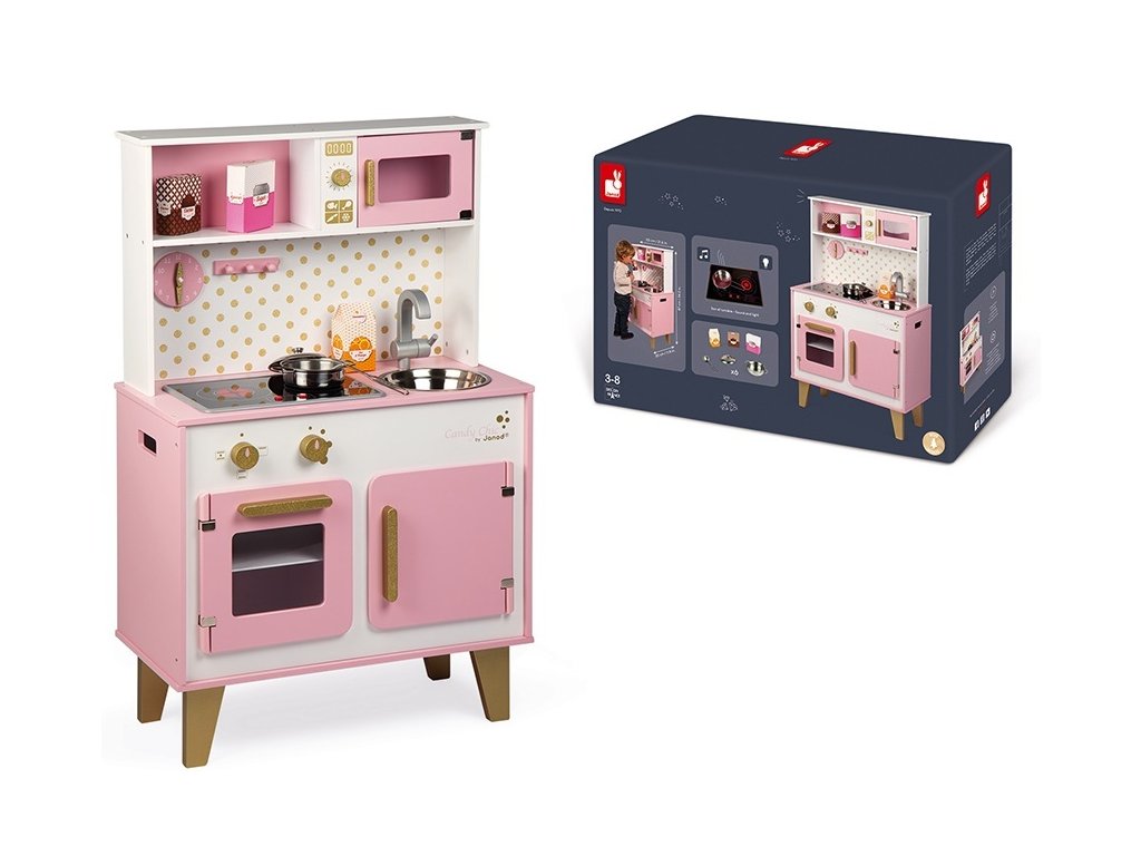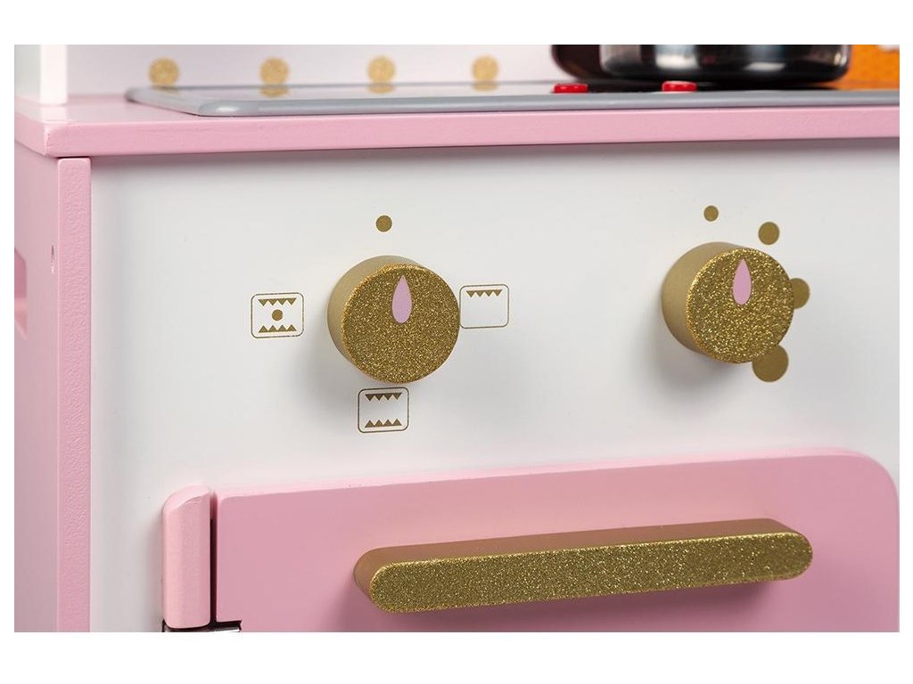Drevená kuchynka Candy Chic Janod je skvelá kuchynka s otočnými gombíkmi, ktoré vydávajú rapkajúci zvuk a nadčasovým dizajnom, je vyrobená v kombinácii trblietavých farieb zlatej a ružovej.