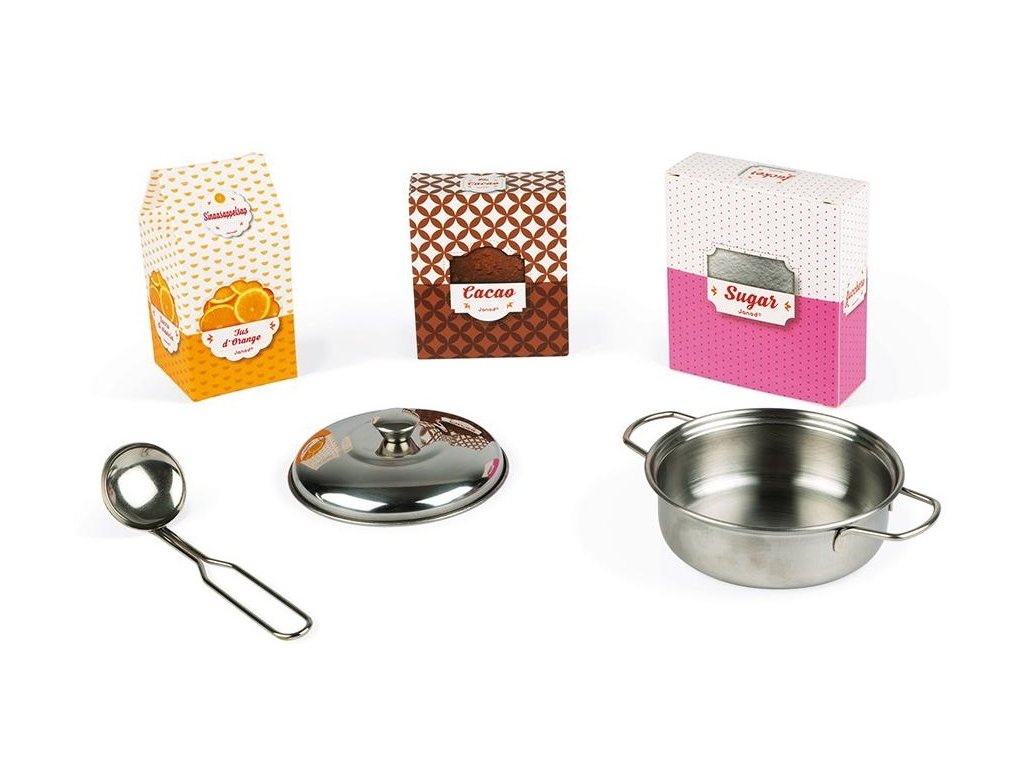 Drevená kuchynka Candy je vyrobená z dreva, súčasťou kuchynky je 6 doplnkov, vešiak na zavesenie kuchynského náradia, kovová lyžica,hrniec s pokrievkou a 3ks potravín v kartónovom obale (pomarančový džús, kakao, cukor).