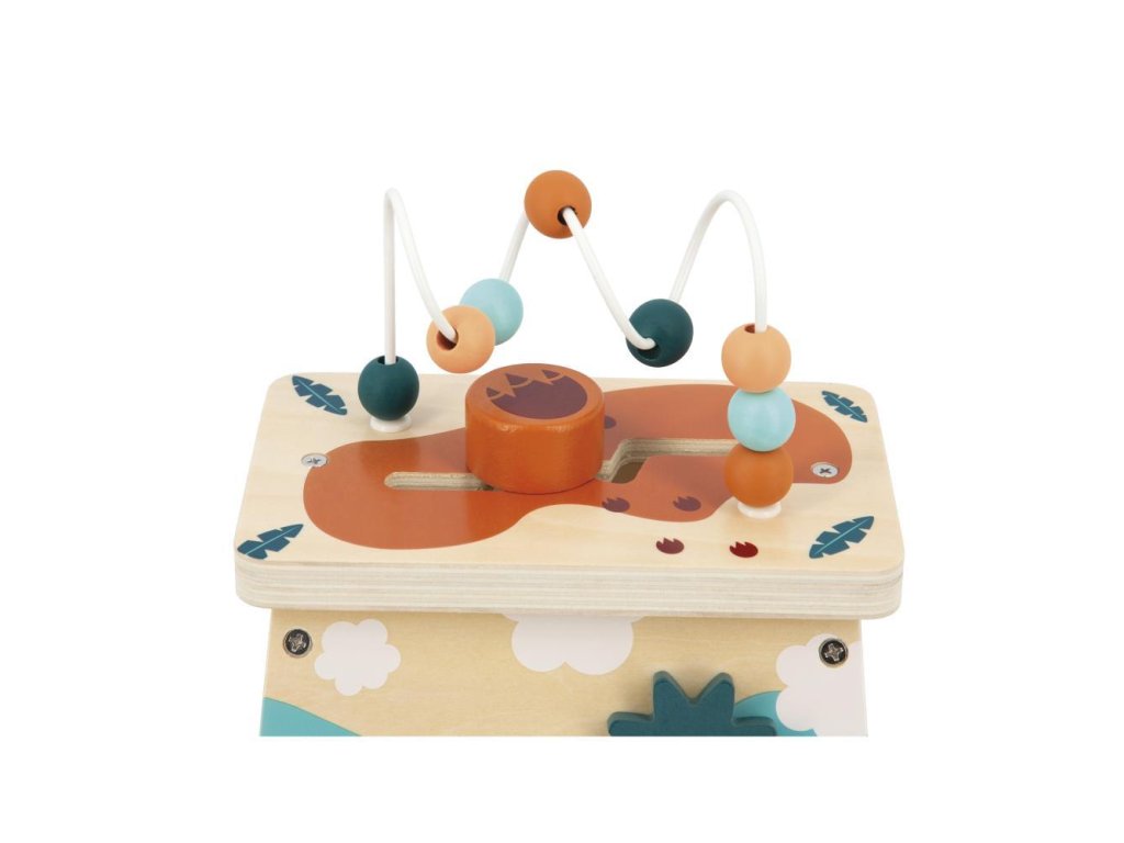 Zadný panel má tri kolieska na otáčanie, na ľavej strane je zrkadlo a navrchu tejto multifunkčnej sopky sa nachádza bludisko a počítadlo s drevenými korálkami.