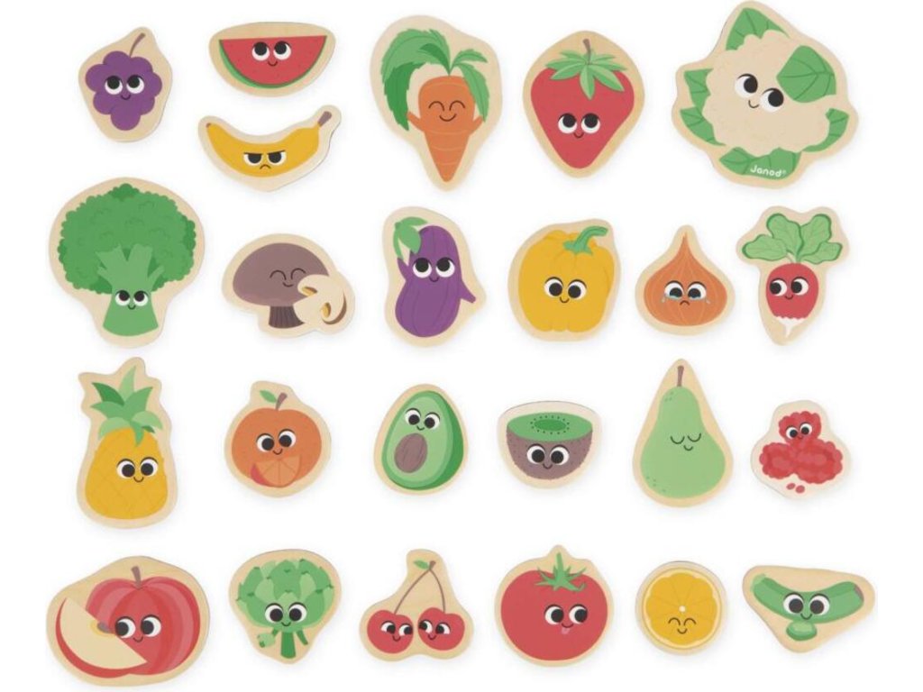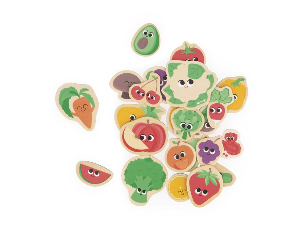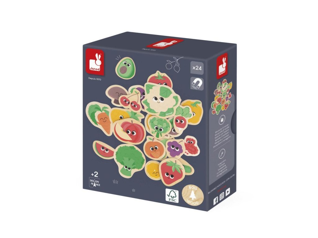 Magnety na ovocie a zeleninu od Janod obsahujú 24 farebných magnetov v tvare rôznych druhov ovocia a zeleniny.