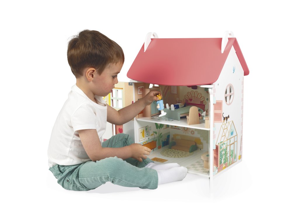 Vitajte v očarujúcom svete tohto nádherného trojposchodového domčeka pre bábiky! Je plný šarmu a krásne zdobený a obsahuje kusy zladeného nábytku a 4 rozkošné drevené postavičky pre vymýšľanie nekonečných príbehov! Otvorte dvere a objavte každú izbu, obývačku, jedáleň, spálňu... rozložte nábytok, oživte svoje postavičky... potom všetko opäť zatvorte pre jednoduché uskladnenie. S ružovými kockami, motýľmi a miniatúrnymi stromčekmi tento domček vyžaruje jemnú, rozmarnú atmosféru. Praktický a dômyselný domček sa otvára aj cez strechu pre ľahký prístup do všetkých miestností. Dvere sú magnetické a ľahko sa zatvárajú ako mávnutím čarovného prútika. Dodáva sa so 4 postavičkami, je tiež kompatibilný s postavičkami do veľkosti približne 11,5 cm a obsahuje 11 doplnkov na usporiadanie podľa vašich predstáv: skriňa s otváracími dverami, posteľ s prikrývkou, toaletný stolík, vaňa, pohovka, lampa, stôl, dve stoličky a kuchynka. Jednoduchá montáž pre okamžitú zábavu! Hračka na hranie vyrobená z dreva FSCTM pre deti od 3 rokov.