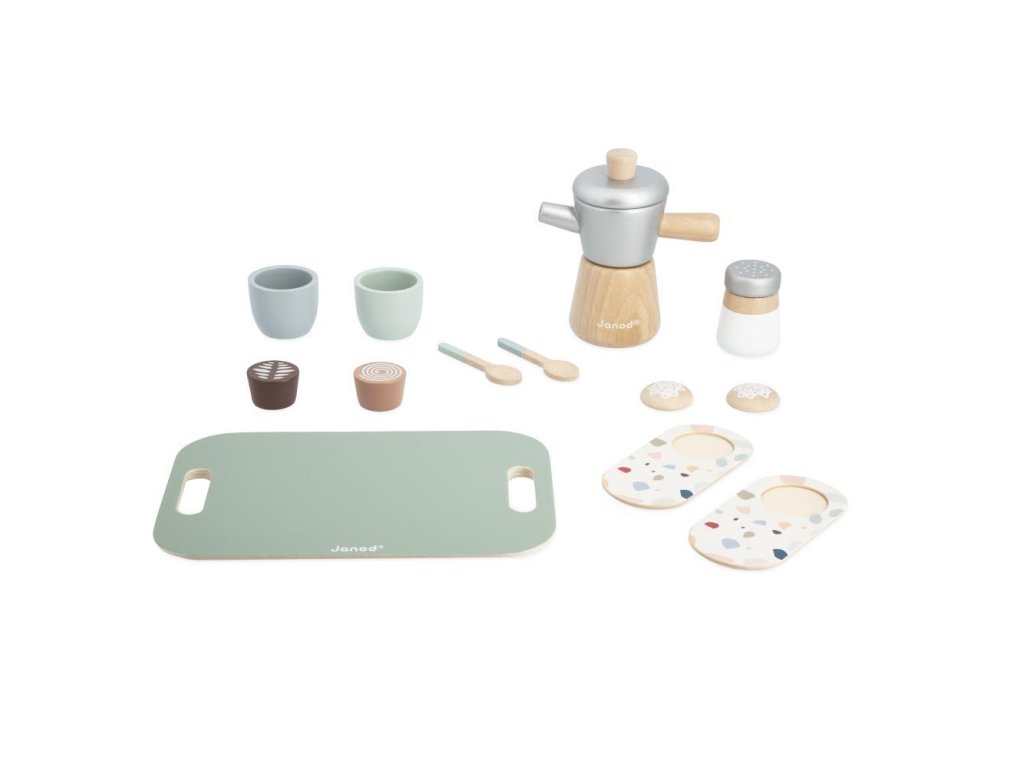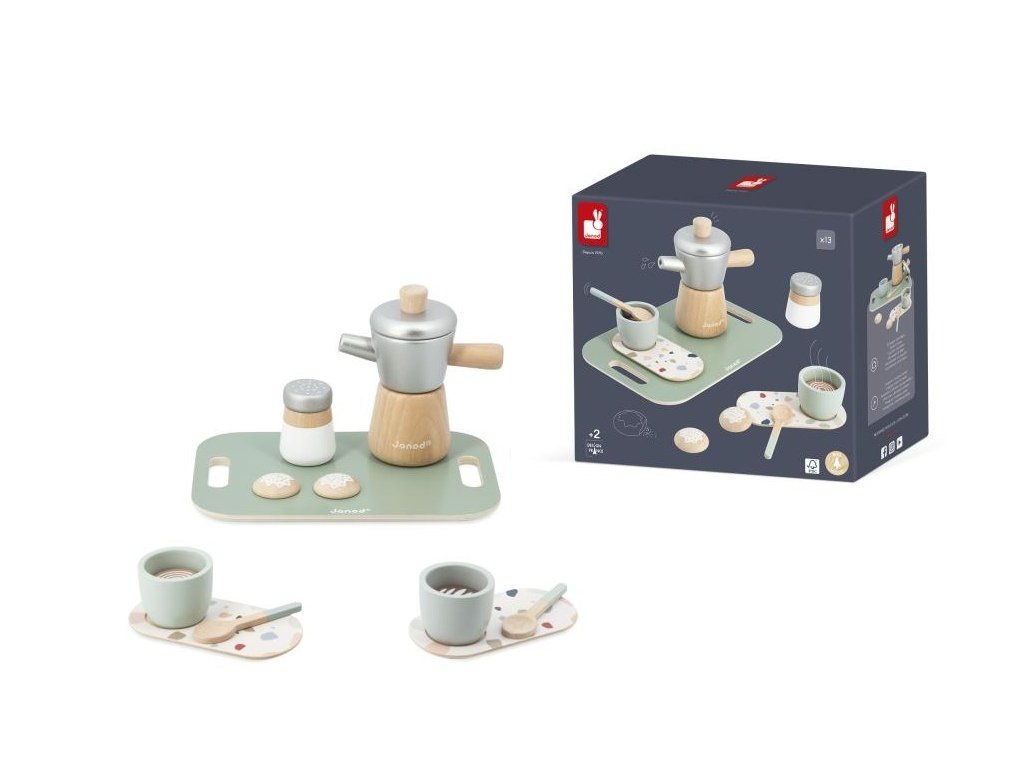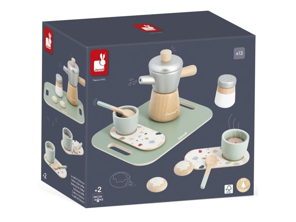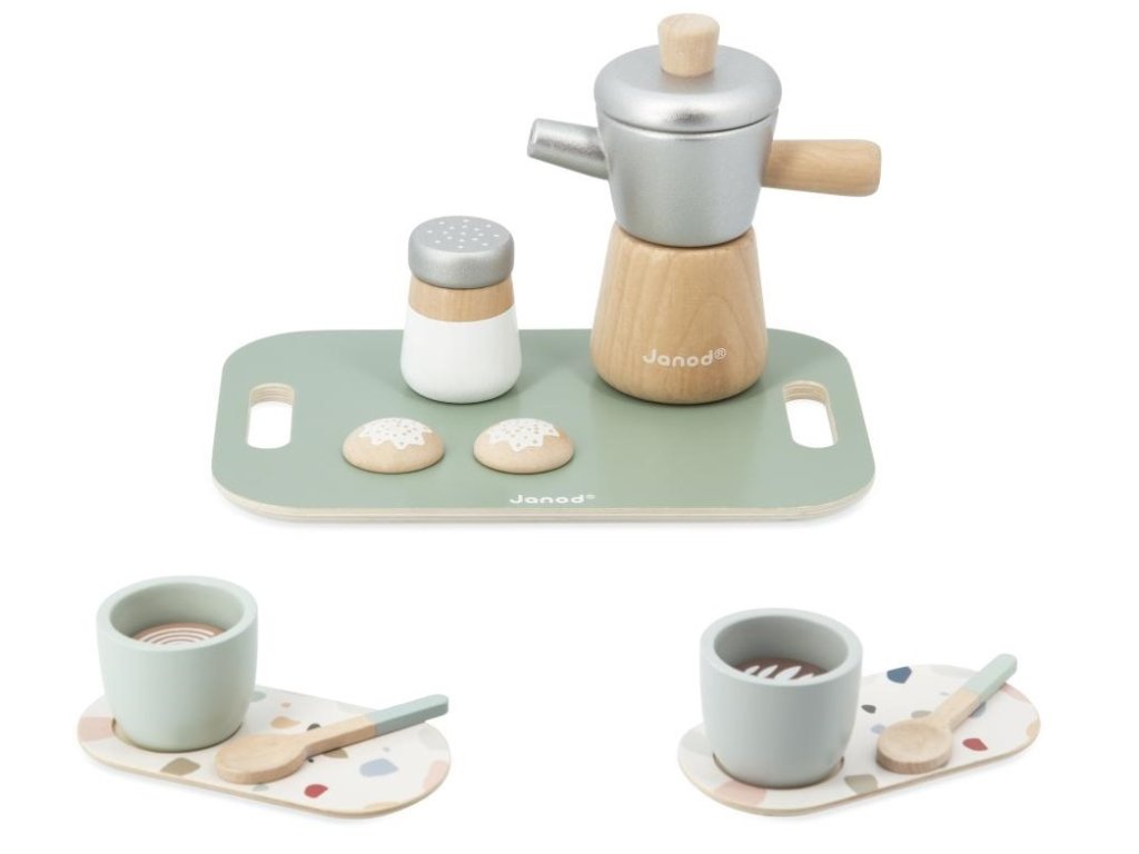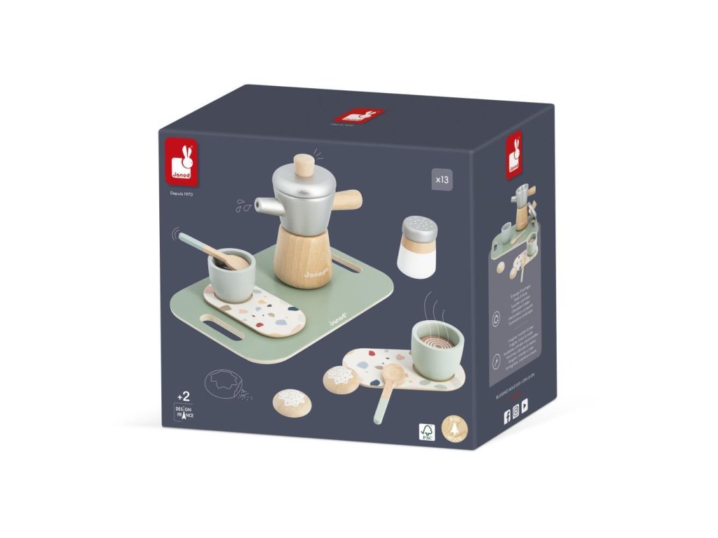 Pretože je dôležité robiť to ako dospelí, táto súprava obsahuje kávovar, 2 šálky, 2 lyžice, 2 podšálky a cukorničku.