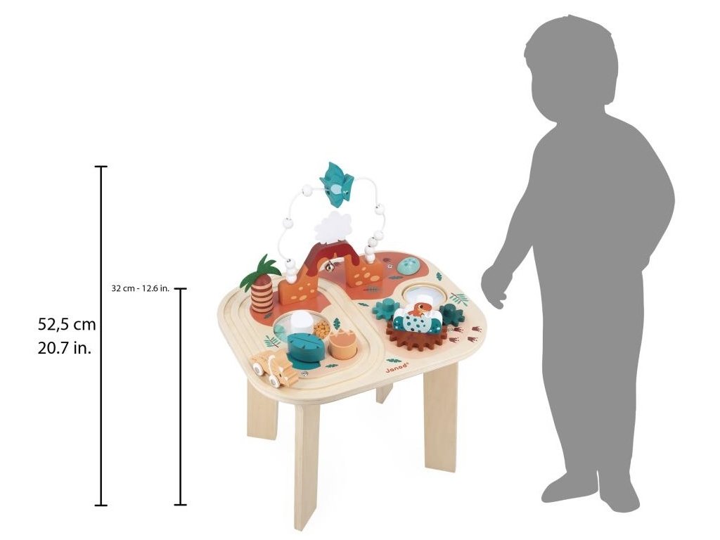 Celkovo má stôl 8 aktivít na dlhé hodiny hrania. Vaše dieťa sa bude môcť zabávať a zároveň rozvíjať svoju zručnosť a predstavivosť. Náučná hračka z dreva FSCTM.