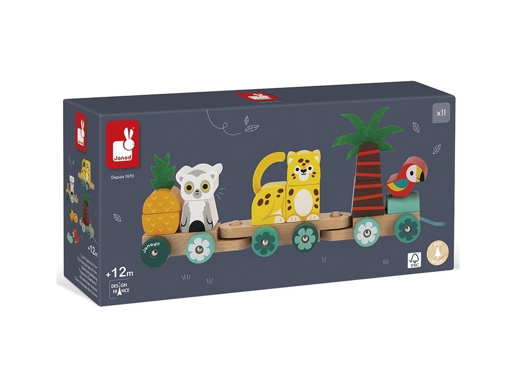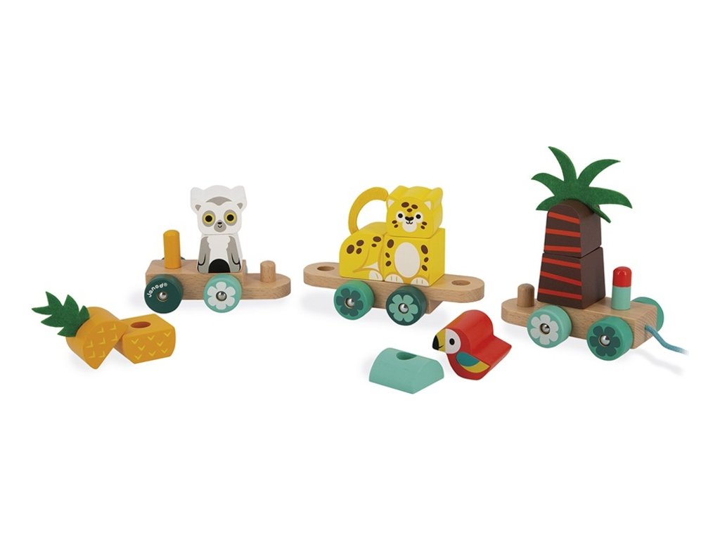 Na vláčiku je roztomilý lemur, farebný papagáj, usmievavý jaguár, sladký ananás a vysoká palma.