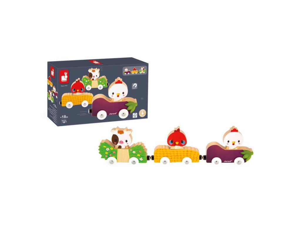 Zvieratá žijúce na lúke aj v maštali milujú preteky na farme! Táto magnetická hračka sa skladá z 3 áut (baklažán, kukurica a poľné kvety) a 3 drevených postavičiek (kura, moriak a krava).