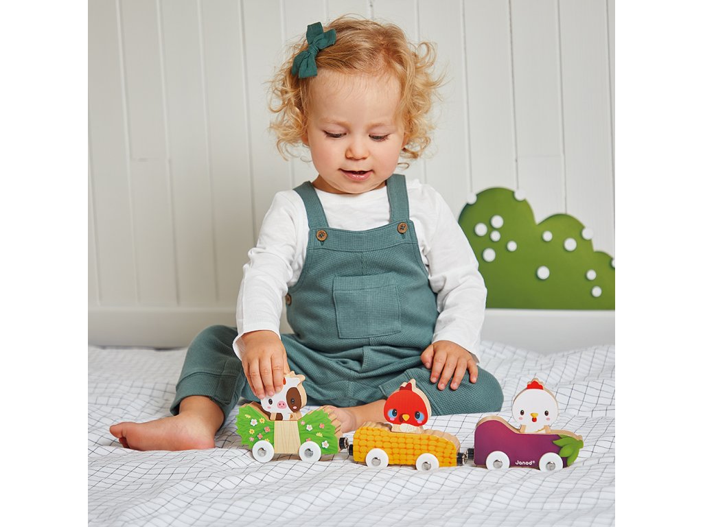 Na farme je čas pretekov! Drevené autíčka a zvieratká v tejto magnetickej hre zaistia veľa rýchlych pretekov pre deti vo veku od 18 mesiacov.