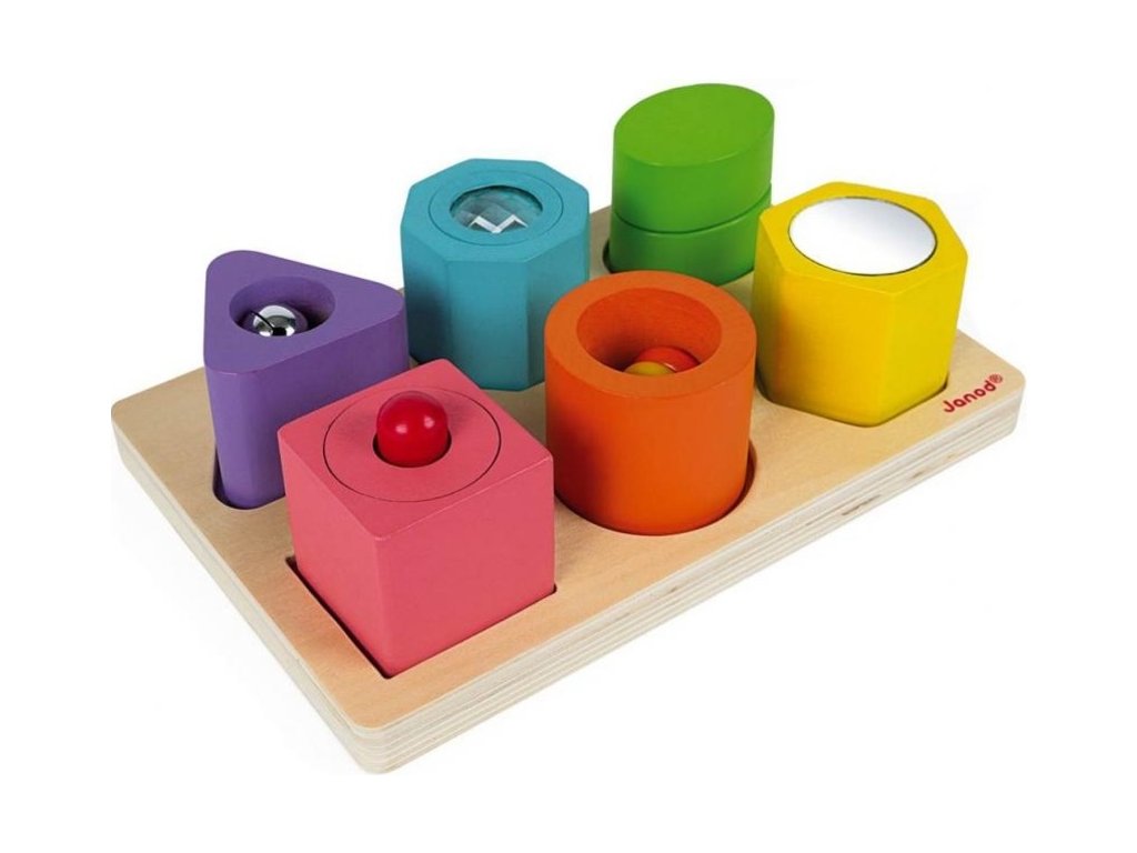 Drevené vkladačka pre najmenšie deti s ktorou sa učia rôzne tvary a farby. Každý dielik vydáva nejaký zvuk alebo má iný aktívny prvok ako napr.zrkadielko a podobne.