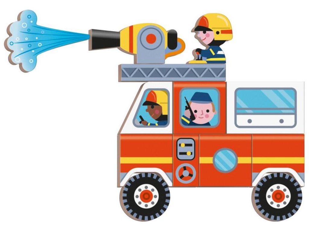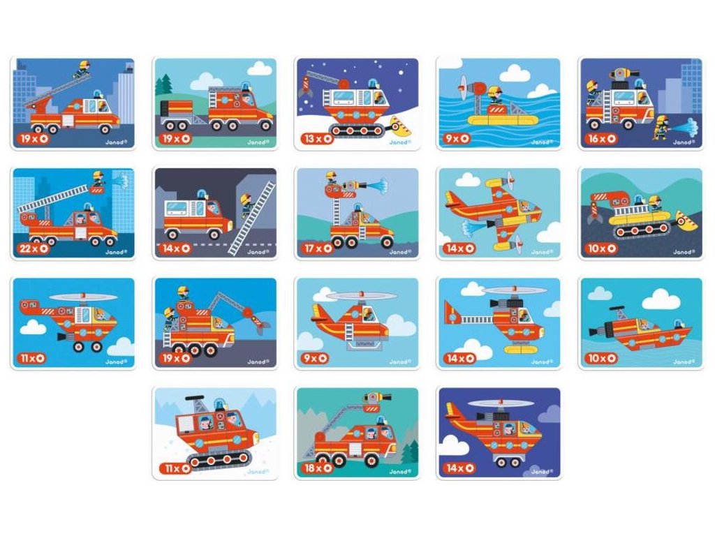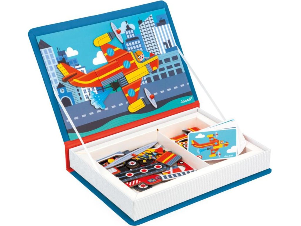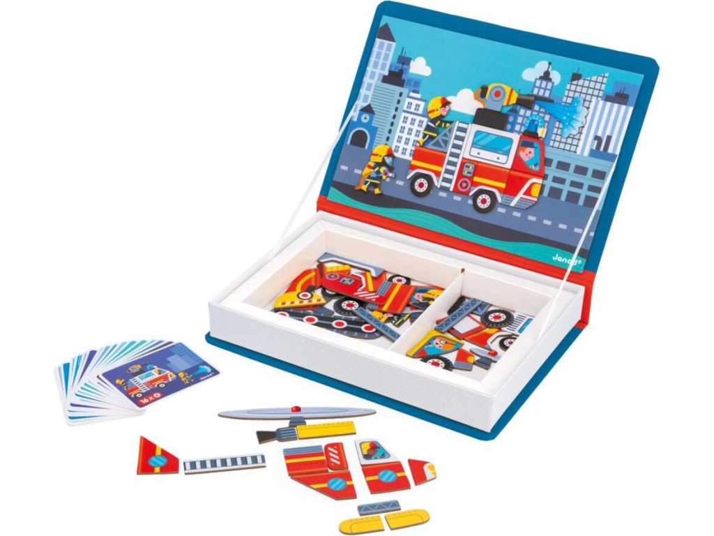 Táto magnetická kniha obsahuje 60 magnetov a 18 kariet. Cieľom hry je reprodukovať vozidlá na magnetickom pozadí podľa modelov na kartách. Deti si tak môžu okrem helikoptéry, lietadla a člna vytvoriť aj klasiku – veľkú verziu hasičského auta!