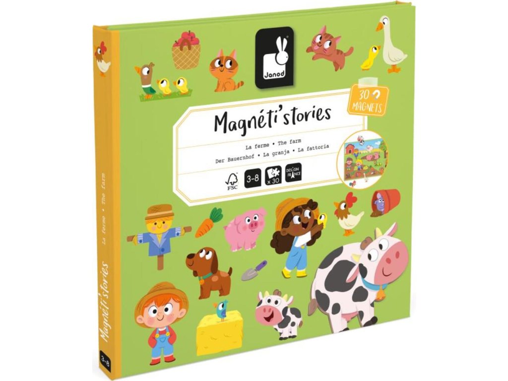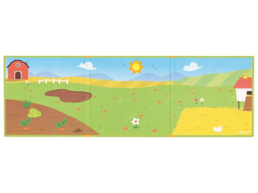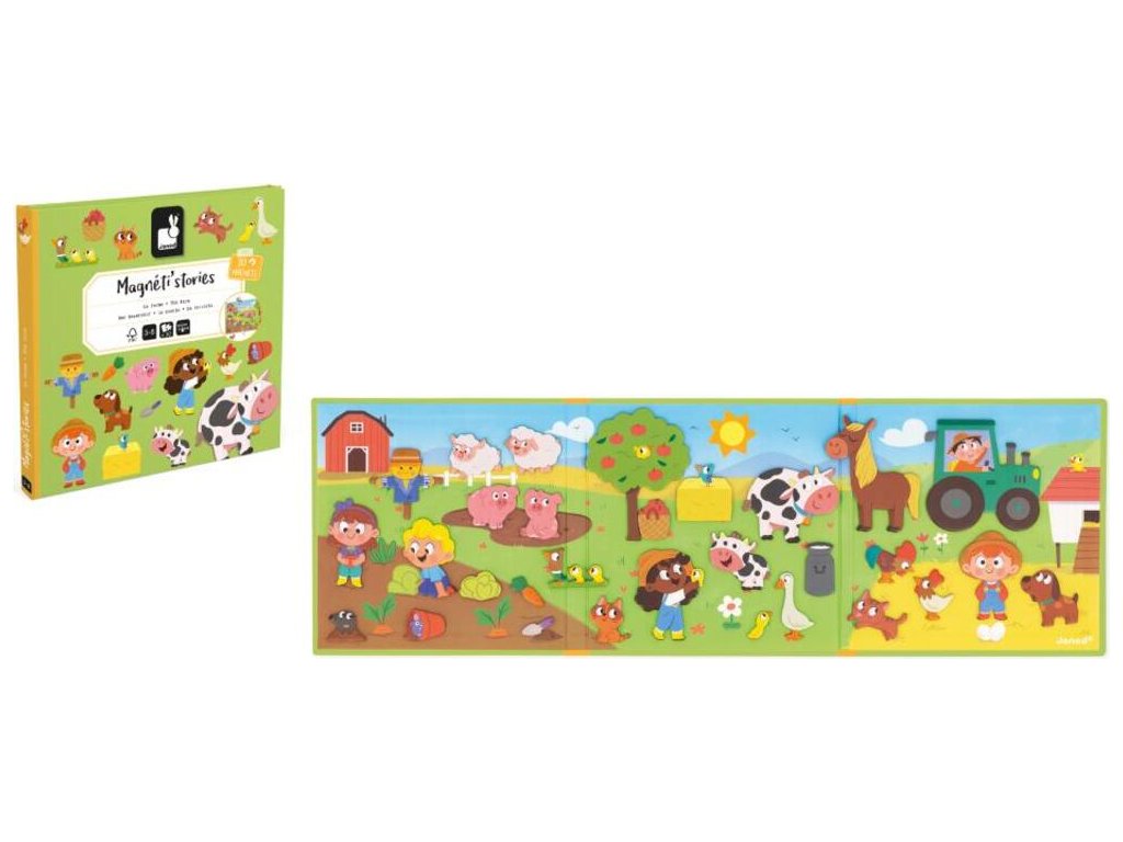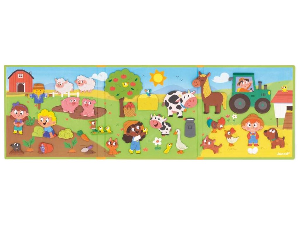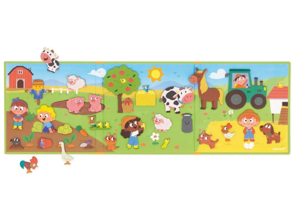 Knihu otvorte a nájdete v nej veľké magnetické pozadie a 30 magnetiek zobrazujúcich farmárske zvieratká a dekorácie, ktoré sú ideálne na doplnenie scény akéhokoľvek príbehu!