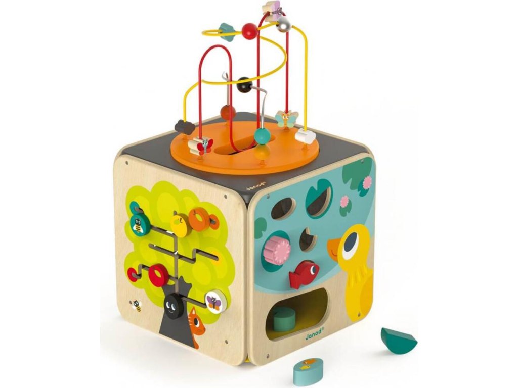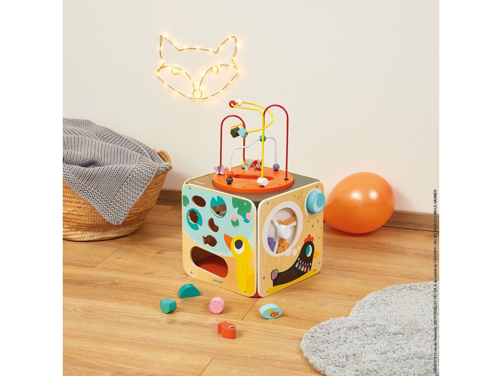 Pestrofarebná drevená multifunkčná kocka MultiActivity Janod so slučkovacím labyrintom a ďalších 8 vzdelávacích aktivít k tomu. Keď otočíte kolieskom mlyna môžete pozorovať ako sa presýpajú vajíčka rôznych veľkostí a aký zvuk vydávajú.