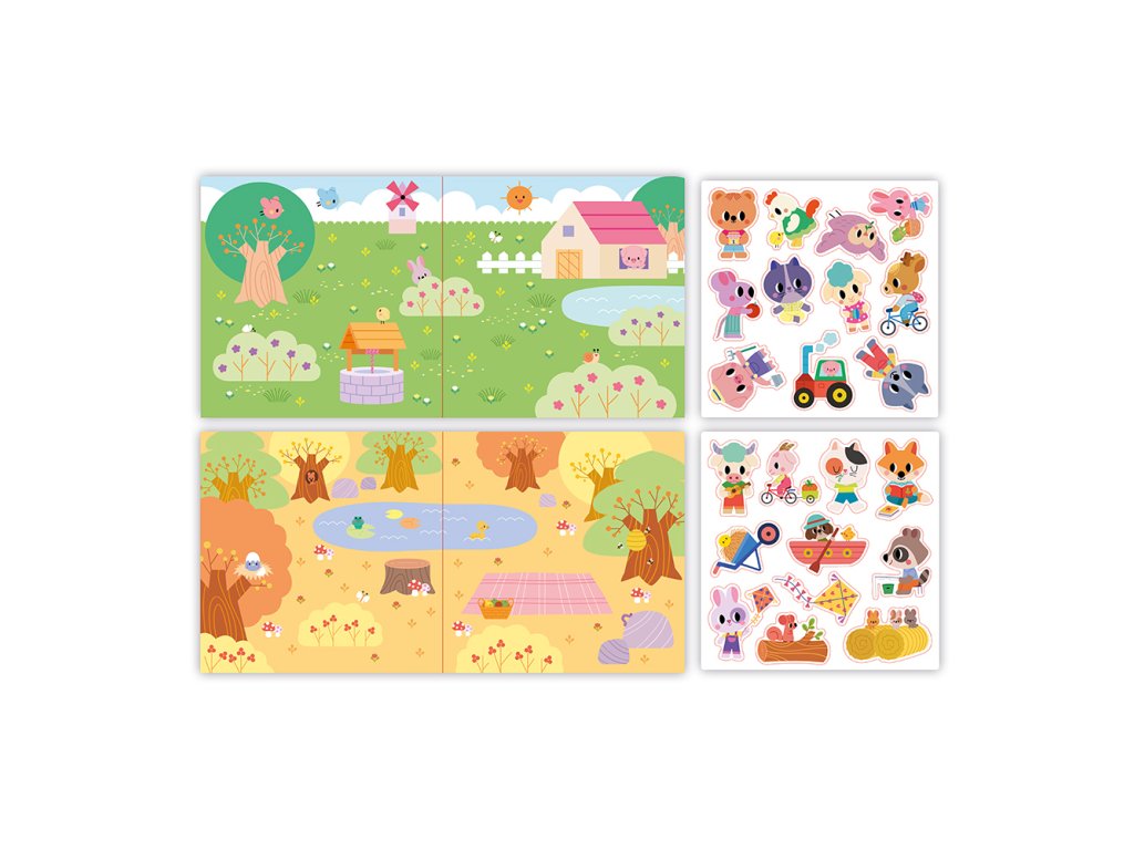 Sada obsahuje hárok s 22 hrubými nálepkami vrátane: zvieratiek na bicykloch, v člne, v traktore alebo s šarkanom. Nálepky sú odolné a opakovane použiteľné. Dieťa nimi môže dosky zdobiť mnohokrát, takto prezentované príbehy voľne obmieňať.