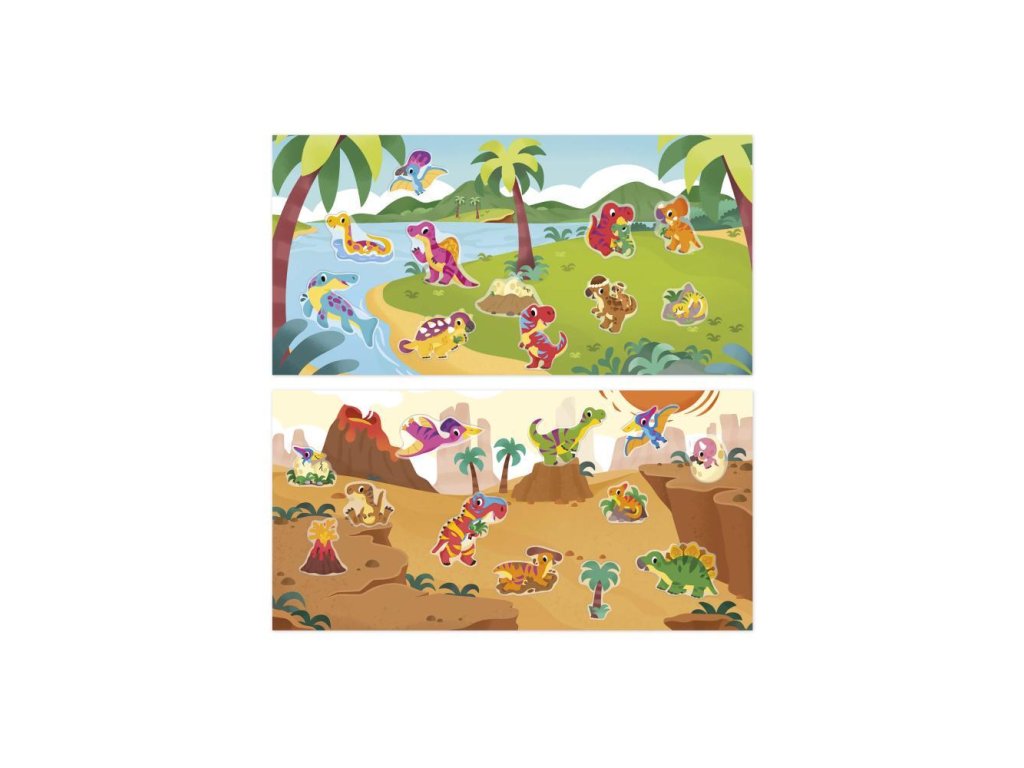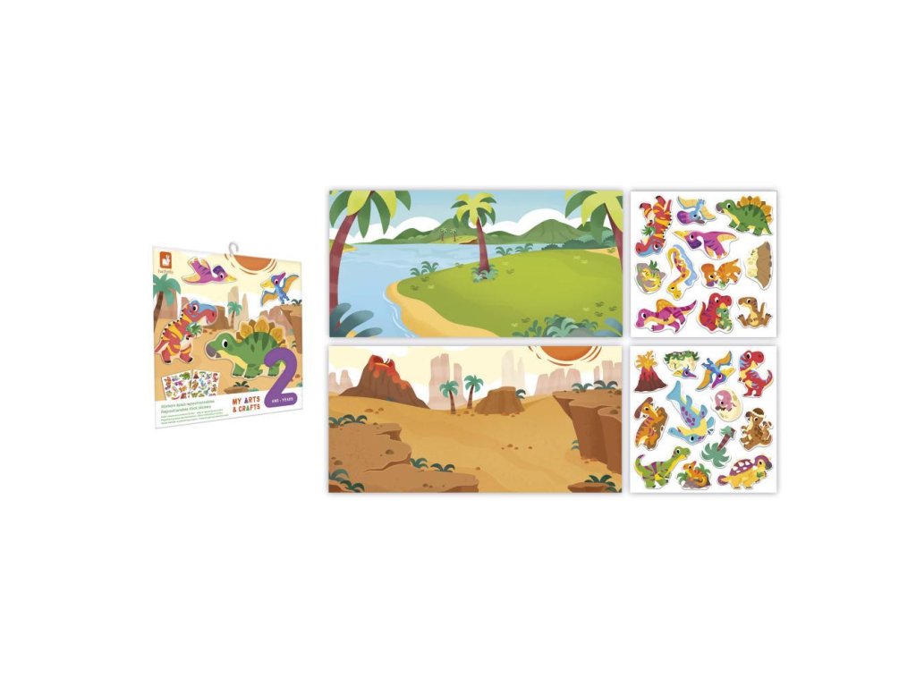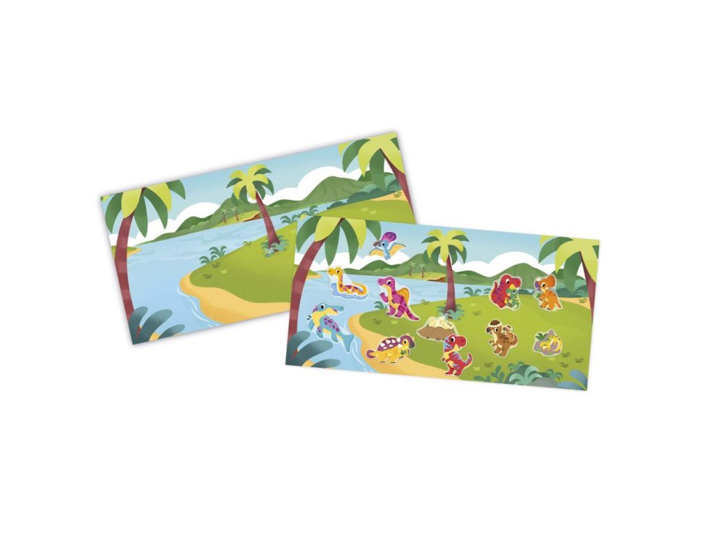 Zvláštnosťou tejto kreatívnej sady sú hrubé nálepky s dinosaurami, špeciálne navrhnuté pre malé ručičky: ľahko sa s nimi manipuluje a ľahko sa odlepujú. Ich premiestniteľný aspekt znamená, že môžete predĺžiť aktivitu, ale tiež si predstaviť príbehy bez strachu, že sa pomýlite a nálepku natrvalo nalepíte na povrch. Keď už hovoríme o scenérii, na obojstrannej podložke, ktorá je súčasťou súpravy, sú k dispozícii 2: suchá vulkanická zóna na jednej strane a tropickejšie prostredie pri vode na druhej strane. Táto manuálna činnosť je ideálna pre škôlkarov.