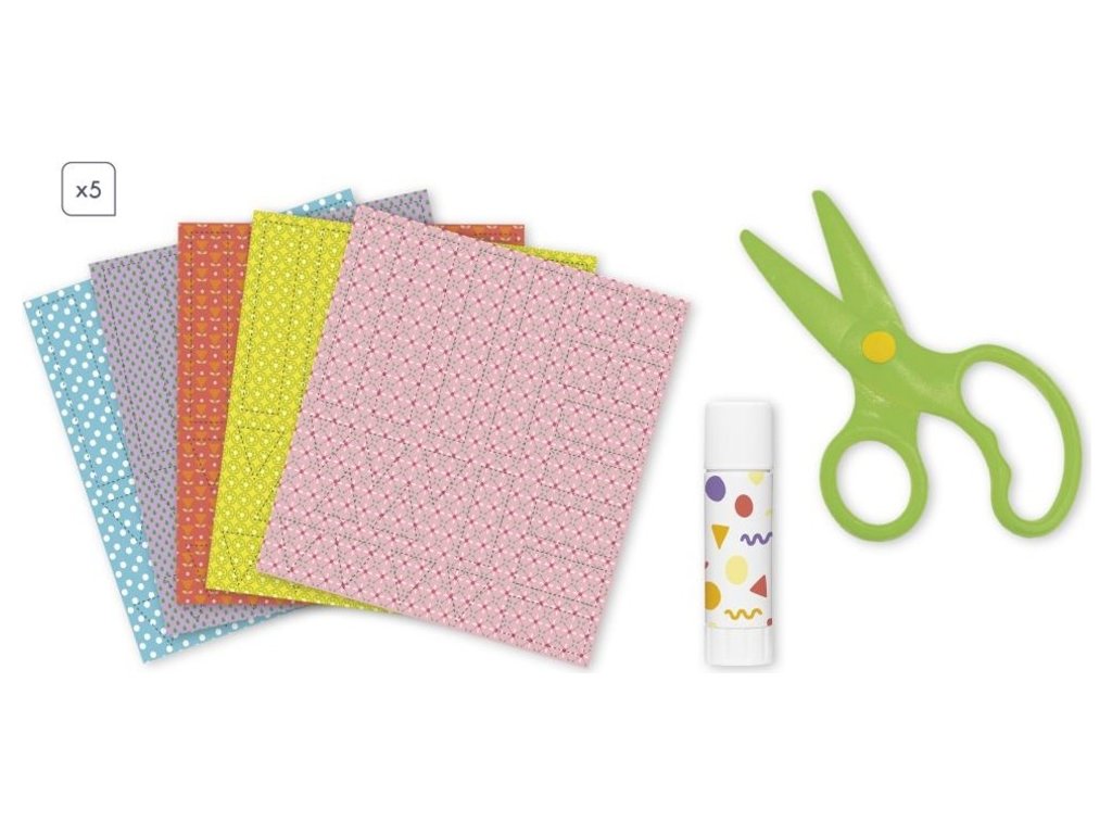 Nožnice bezpečné pre deti (ktoré strihajú iba papier) a 5 hárkov vzorovaného papiera prehovorí za kreativitu začínajúcich umelcov.
