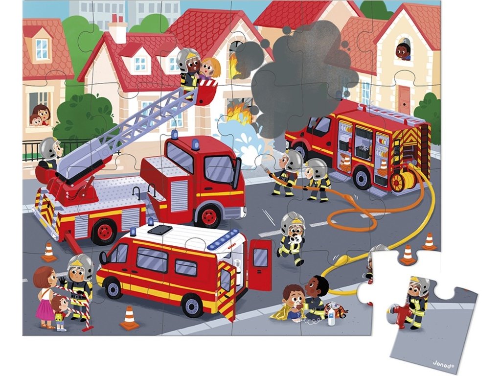 V každom meste predsa musia byť hasiči! Na obrázku nájdete veľké červené hasičské auto, požiarnikov, sanitku i horiaci dom. Zvládnutie požiaru, starostlivosť o zranených a zabezpečenie okolia: je to deň plný dobrodružstiev, ktorý čaká našich malých hasičov!