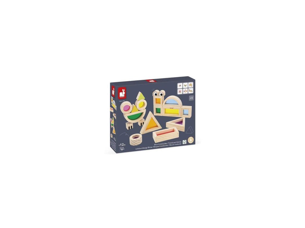 Janod Sensory Senzorická drevená stavebnica s farebnými sklíčkami a predlohami 12 ks