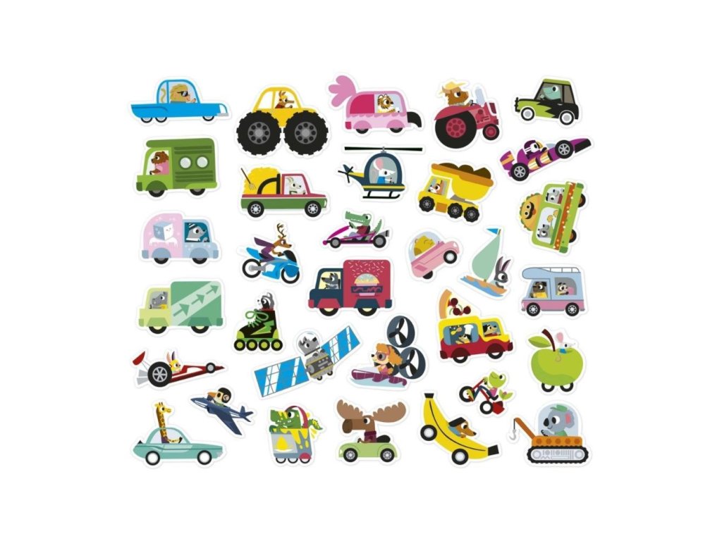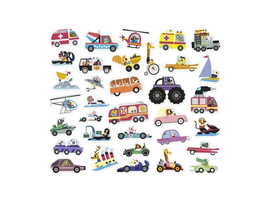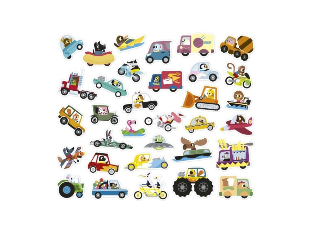 Nálepky zobrazujú rôzne vozidlá, vrátane tých, ktoré sa dnes už len zriedka vidia, ako napríklad jednokolka, helikoptéra, vodný skúter, tandem alebo monster truck. Sady nálepiek JANOD sú bohatou kategóriou produktov, ktoré podnecujú kreatívnu hru a podporujú rozvoj manuálnych zručností u detí všetkých vekových kategórií.