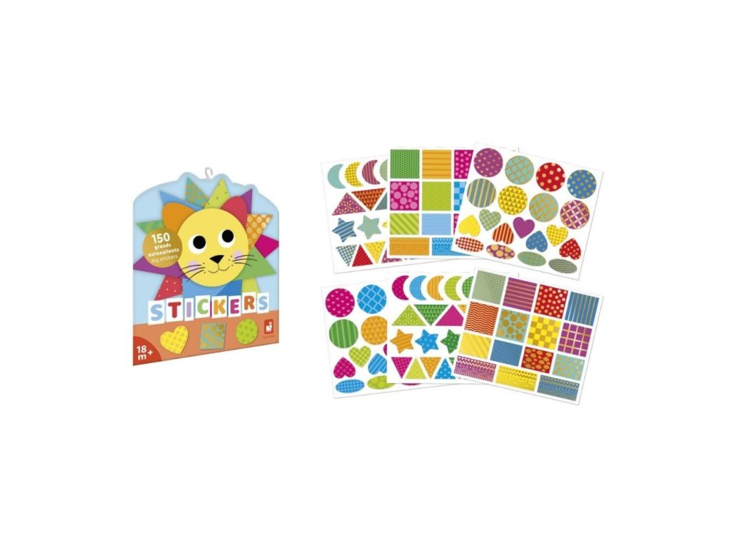 Sada nálepiek Geometrické tvary francúzskej značky JANOD obsahuje 150 veľkých, opakovane použiteľných nálepiek, rozmiestnených na 6 hárkoch (každý 17 x 20 cm). Nálepky sú vhodné pre deti od 18 mesiacov – majú optimálnu veľkosť pre malé ručičky.