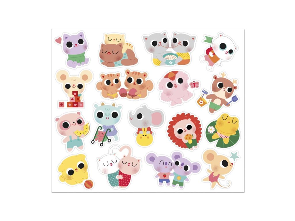 Sada samolepiek Malé zvieratká francúzskej značky JANOD obsahuje 100 ks veľké opakovane použiteľné samolepky, usporiadané na 6 listoch (17 x 20 cm každý).