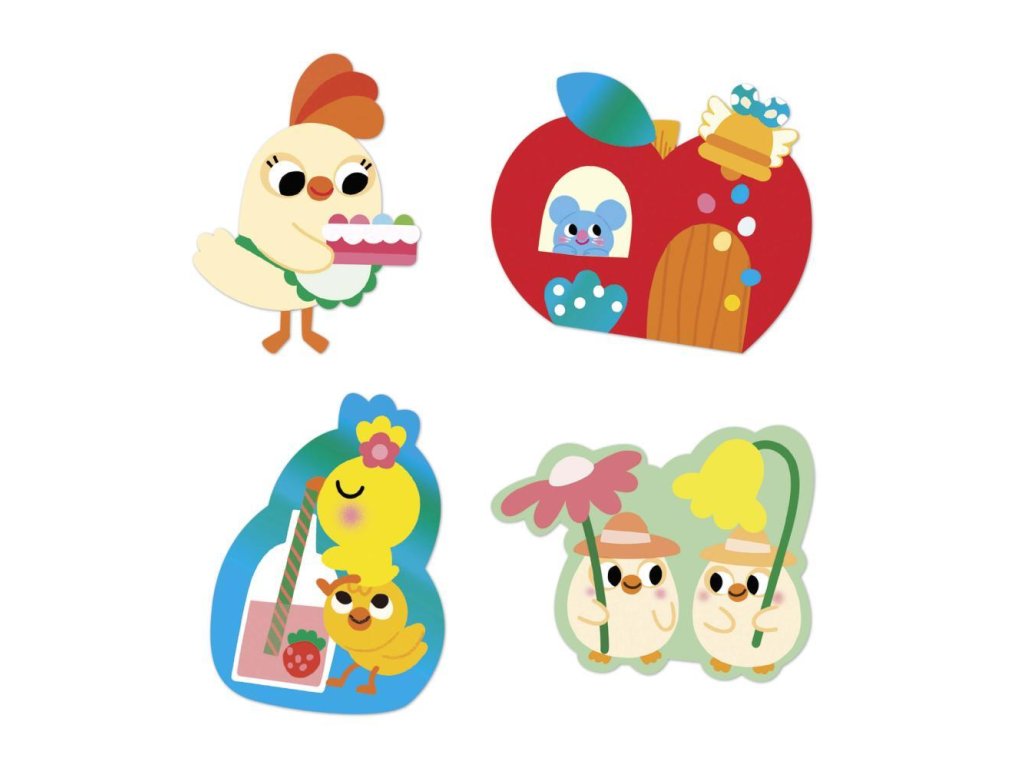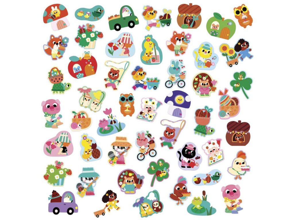 Samolepky zobrazujú roztomilé scény zo života zvieratiek na záhrade, napr. žabky pri rybníku, veveričky doma zo žaluďa alebo medvedíka chytajúceho motýle. Polovica z nich má lesklý kovový povrch, čo im dodáva jedinečné kúzlo. Perfektný ako darček.