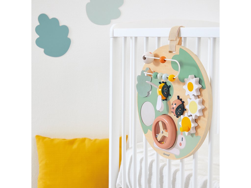 Táto doska je veľmi praktická a prispôsobí sa najpohodlnejšej hernej polohe dieťaťa. Vďaka pohyblivej základni je možné dosku s aktivitami nastaviť pod uhlom 45°, aby sa dieťa mohlo ľahko hrať v sede alebo pri stole. Bez podstavca je doska úplne plochá a dá sa zavesiť na stenu alebo na tyče ohrádky pomocou veľkého suchého zipsu v hornej časti. Je to jednoduchá, komplexná hračka v jemných farbách, ktorá pomôže vášmu dieťaťu rozvíjať jemnú motoriku a zručnosť.