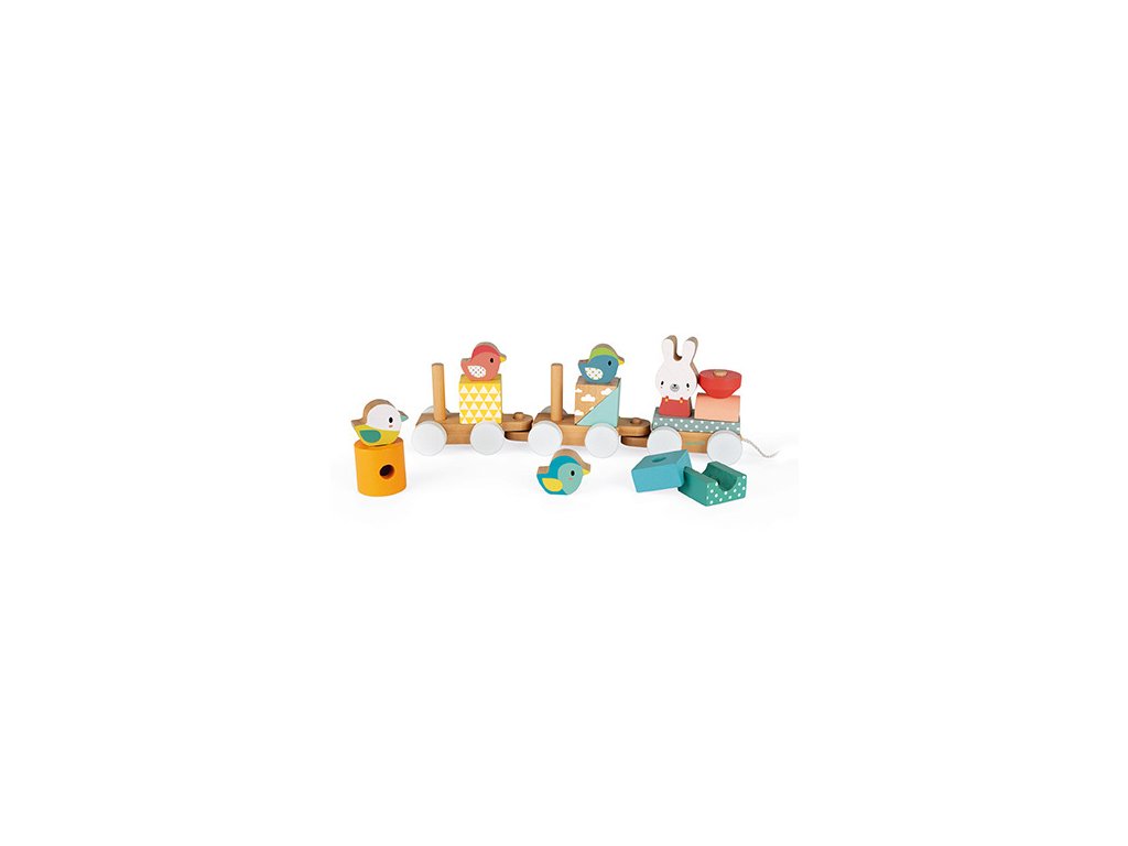 Drevený vláčik Pure Janod na ťahanie je nádherná hračka pre detičky od 12 mesiacov. Vláčik si môžu poskladať podľa svojich predstáv, pretože každá časť sa dá z neho zložiť a vložiť na iné miesto. Na vláčiku je väčší zajačik a kocky - vagóny, na každej kocke sedí roztomilý farebný vtáčik. Deti si môžu kocky na vagónoch vymeniť, zložiť podľa seba, vymeniť vtáčikov, zložiť menší, alebo väčší vláčik. Tento vláčik deti zaujme svojimi krásnymi pastelovými farbami a roztomilými zvieratkami. Pri tejto hre si deti rozvíjajú a zdokonaľujú jemnú motoriku. Rozmer: 31,4 x 6,8 x 11,5 cm Vhodné pre deti od 12 - 36 mesiacov