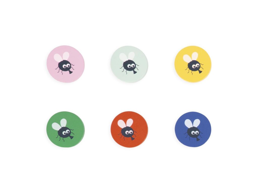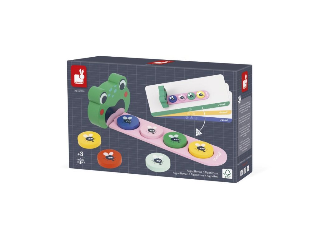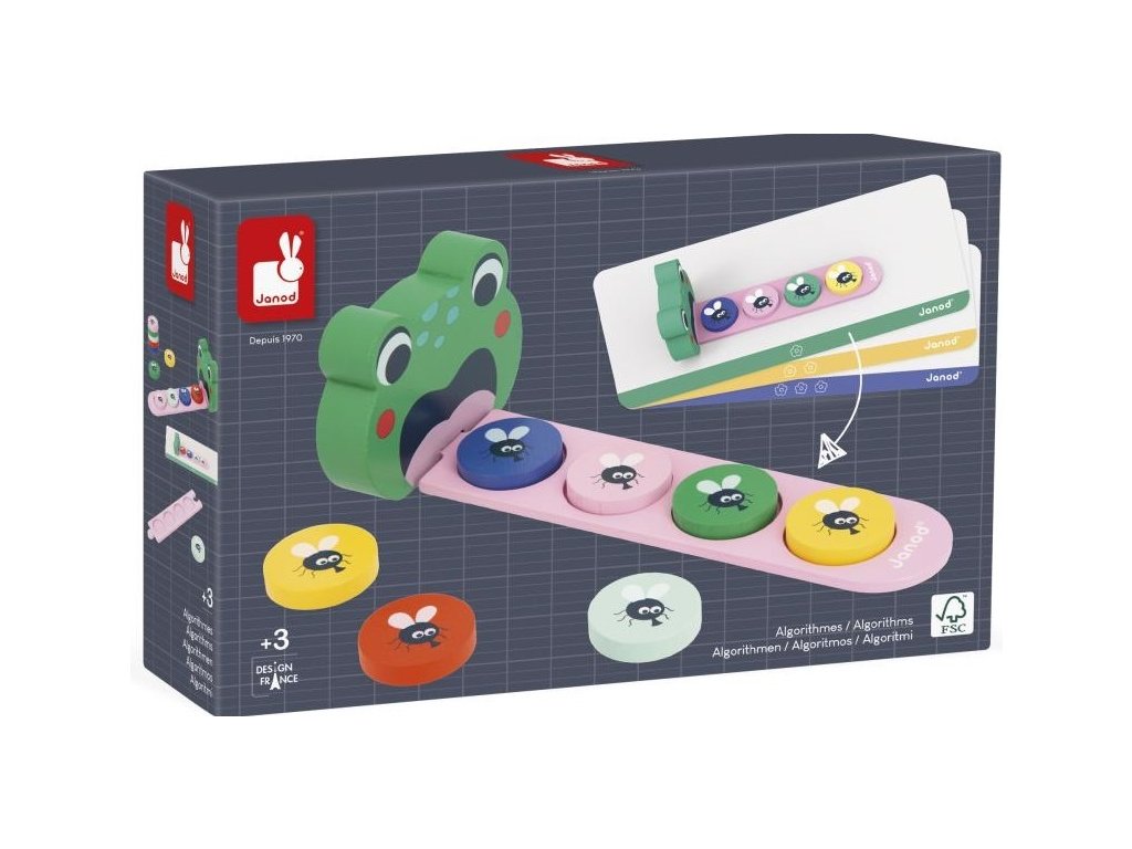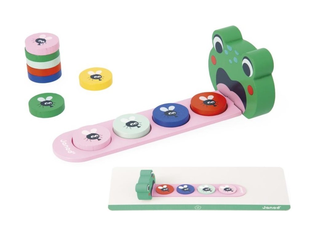 Umiestňovaním múch na jazyk žaby sa vaše dieťa zábavnou formou naučí, ako reprodukovať a identifikovať logickú postupnosť farieb. Hračka vyrobená z dreva FSCTM a lepenky.