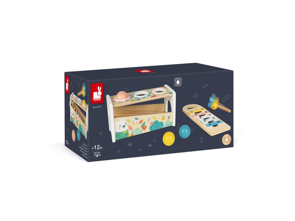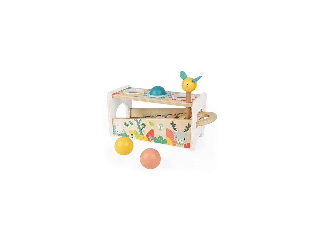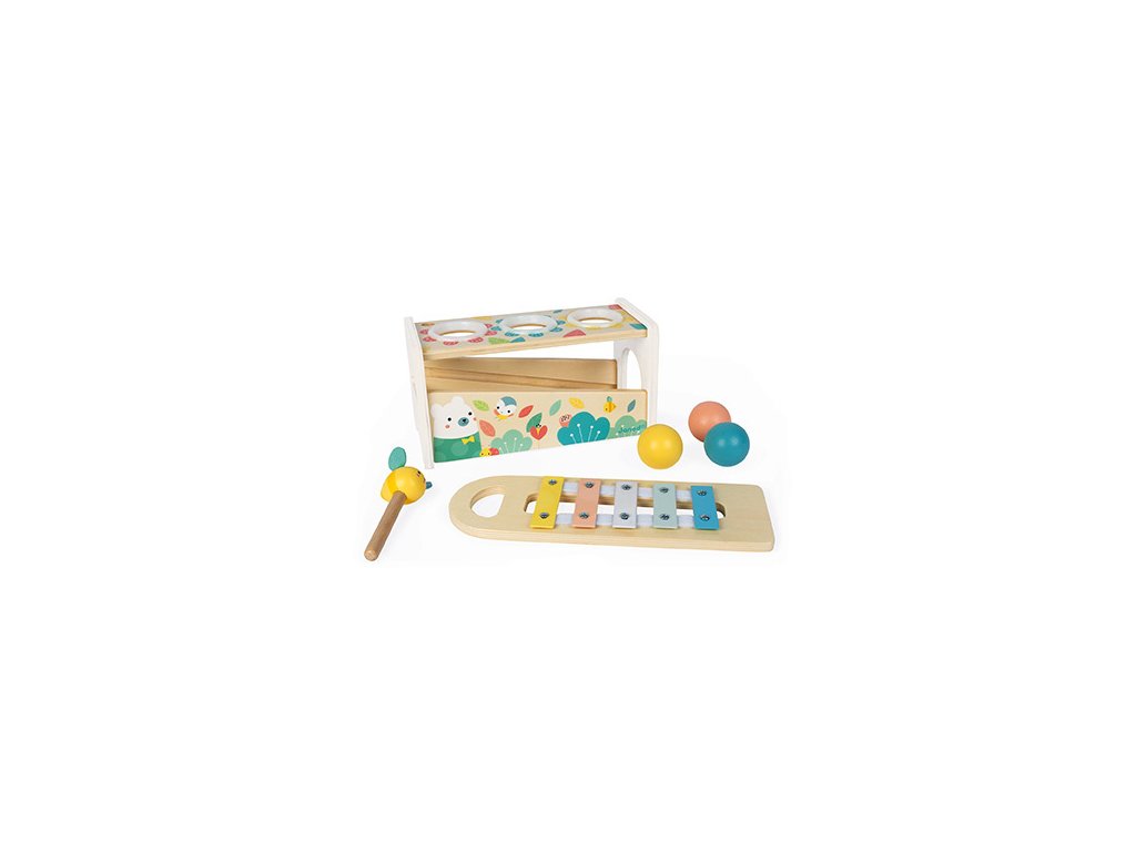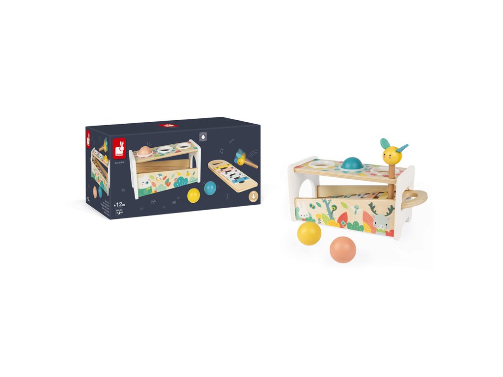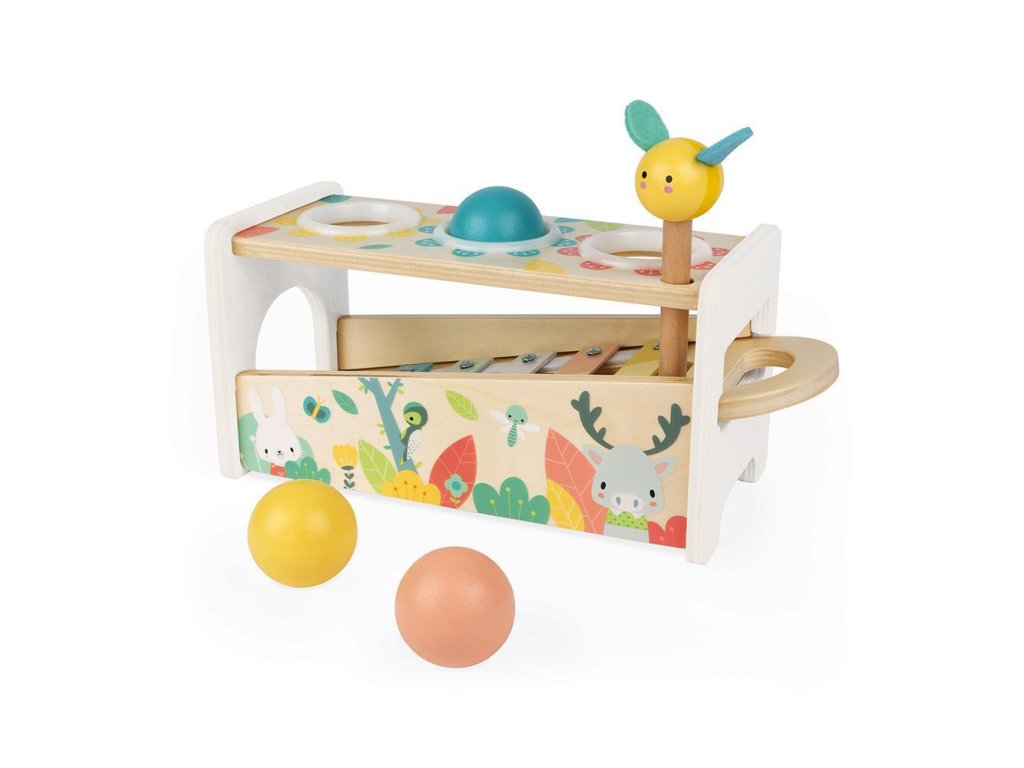 Krásna drevená hračka zatĺkačka a xylofón v jednom na rozvoj zručnosti vo veľmi jemných a moderných farbách s roztomilými drevnými zvieratkami. Hračka Vášmu dieťaťu pomôže rozvíjať obratnosť a zároveň si s ňou užije aj veľa zábavy. Dve hry v jednom - kladivom so včeličkou zatlčieme 3 drevené farebné guličky a tie vydávajú krásny zvonivý zvuk na klávesoch xylofónu a zároveň súčasťou hračky je samotný odnímateľný xylofón a tak Vaše dieťa môže hrať kdekoľvek!Hračka je vhodná pre deti od 12 mesiacov.Rozmer: 29,1 x 12 x 13 cm