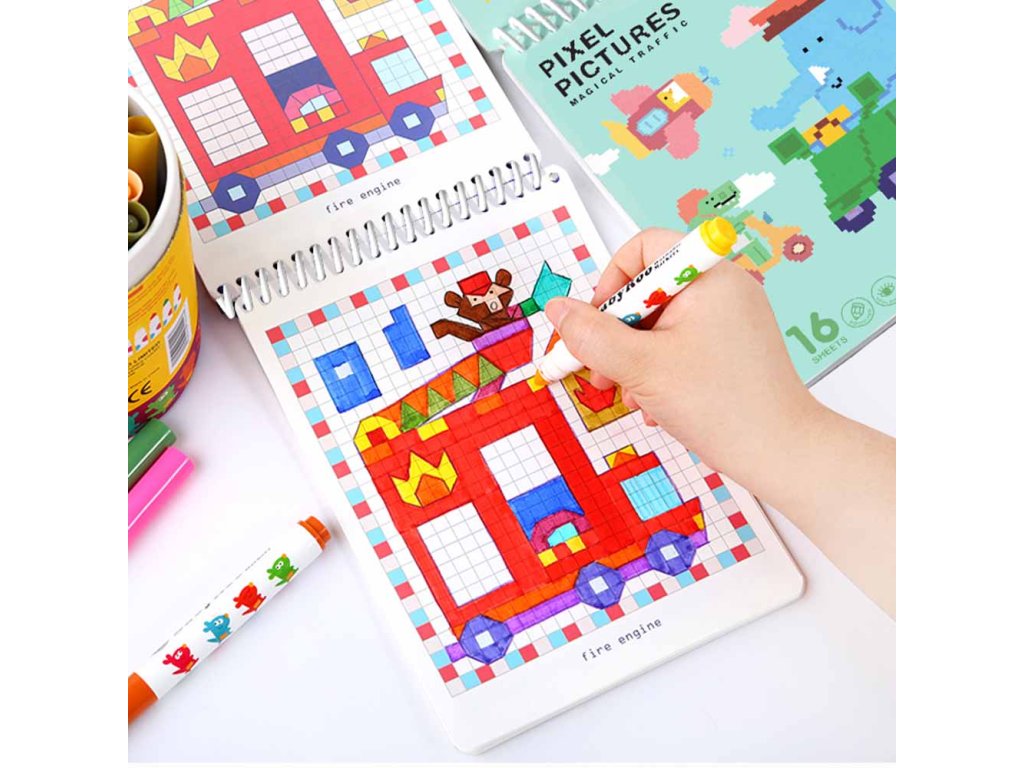 Pixel Art Omaľovánky Dopravné prostriedky Farebné štvorčeky pre malých umelcov Deti farebne vyplnia predtlačený pixel art obrázok podľa štvorčekov a vytvoria si vlastné majstrovské dielo. Každá strana obsahuje jednoduchý šablónový vzor, ktorý rozvíja trpezlivosť, jemnú motoriku a sústredenie. Bezpečná a nenáročná Jarmelo aktivita pre deti od 3 rokov – vhodná aj na dlhšie cestovanie či pokojné chvíle doma.Čo deti čaká v balení? 16 predtlačených strán s pixel art motívmi dopravných prostriedkovFarebná legenda na každý obrázok – stačí vyplniť štvorčeky farbamiKompaktný formát (cca 9,5 × 9,5 cm) – ideálny na cesty aj výtvarné chvíle doma