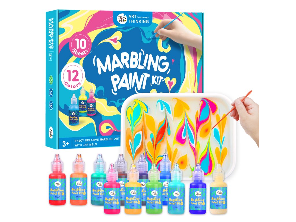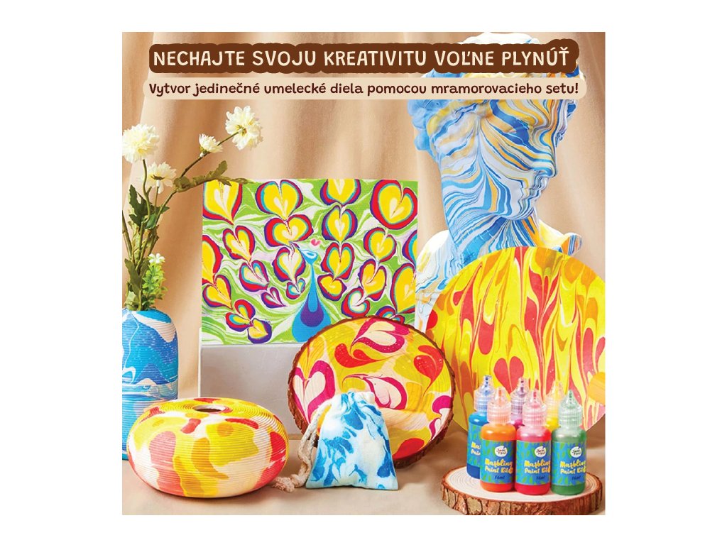 Sada na mramorovanie 12 farieb Premeň vodu na umelecké plátno! Tento magický mramorovací set od Jarmelo prináša nekonečné vzory pomocou kúzla vody a farieb. Stačí vytlačiť farbu, navzorkovať a preniesť na papier – radosť pre malé ruky i odvážnu kreativitu. Netoxické farby, minimálny neporiadok a výsledky, ktoré budú tešiť deti i rodičov.Čo obsahuje a čím deti v momente zaujme? 12 fliaš farby, ktoré sa nádherne miešajú na vode10 špeciálnych papierov pripravených na mramorové vzoryPomôcky - miska, špachtľa, pipeta, slamka,... Netoxické a bezpečné pre deti od 3 rokovUčenie cez hru - podporuje tvorivosť, experimentovanie a precíznu motorikuVšetko umiestnené v peknej krabici – skvelé ako darček