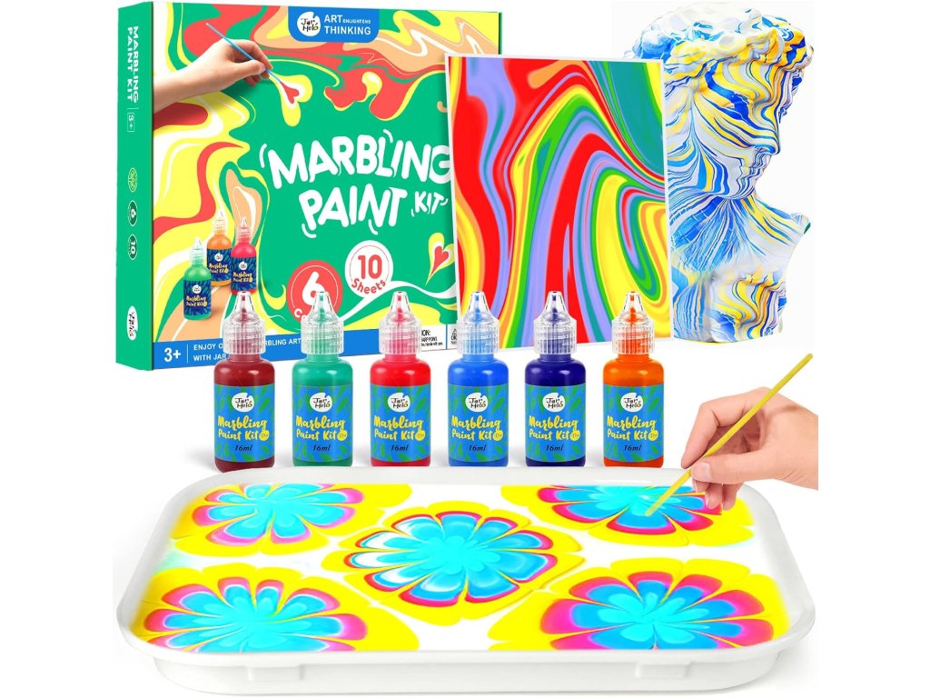 Sada na mramorovanie 6 farieb Premeň vodu na umelecké plátno! Tento magický mramorovací set od Jarmelo prináša nekonečné vzory pomocou kúzla vody a farieb. Stačí vytlačiť farbu, navzorkovať a preniesť na papier – radosť pre malé ruky i odvážnu kreativitu. Netoxické farby, minimálny neporiadok a výsledky, ktoré budú tešiť deti i rodičov.Čo obsahuje a čím deti v momente zaujme? 6 fliaš farby (16 ml), ktoré sa nádherne miešajú na vode10 špeciálnych papierov pripravených na mramorové vzoryPomôcky - miska, špachtľa, pipeta, slamka,... Netoxické a bezpečné pre deti od 3 rokovUčenie cez hru - podporuje tvorivosť, experimentovanie a precíznu motorikuVšetko umiestnené v peknej krabici – skvelé ako darček