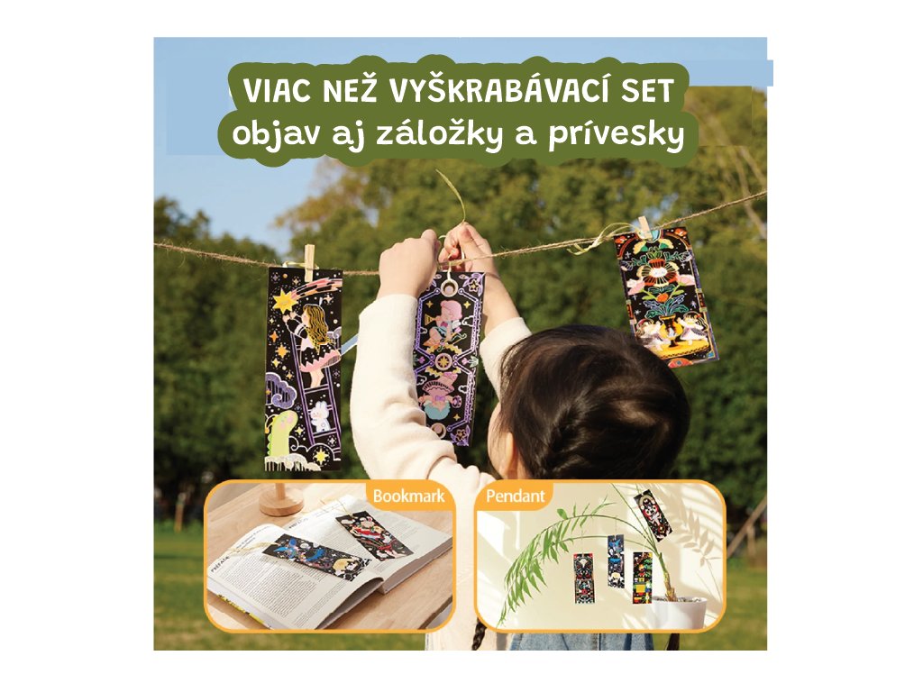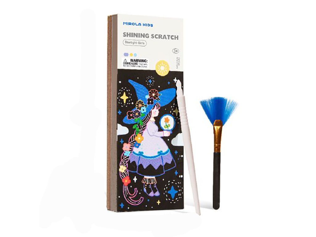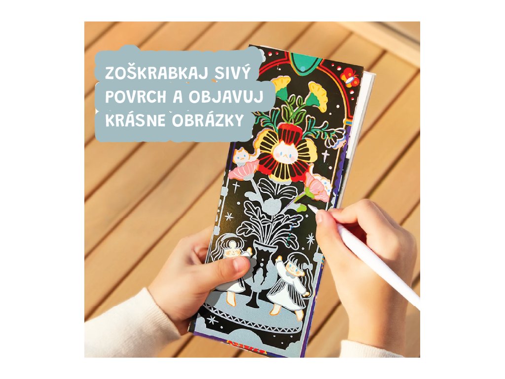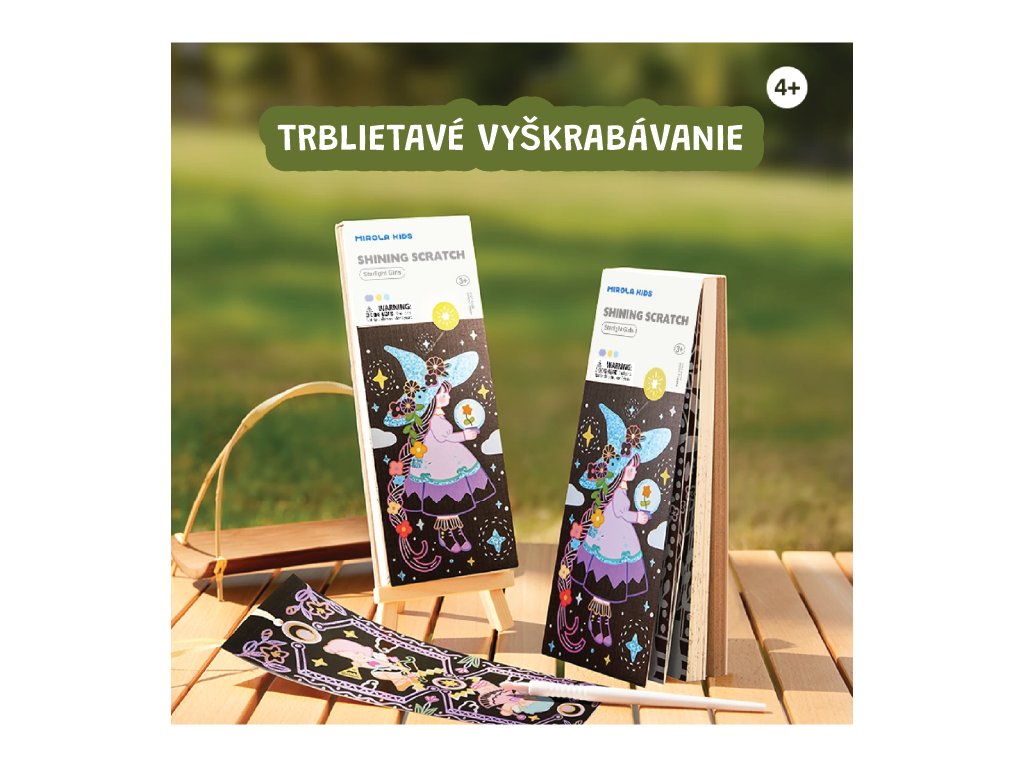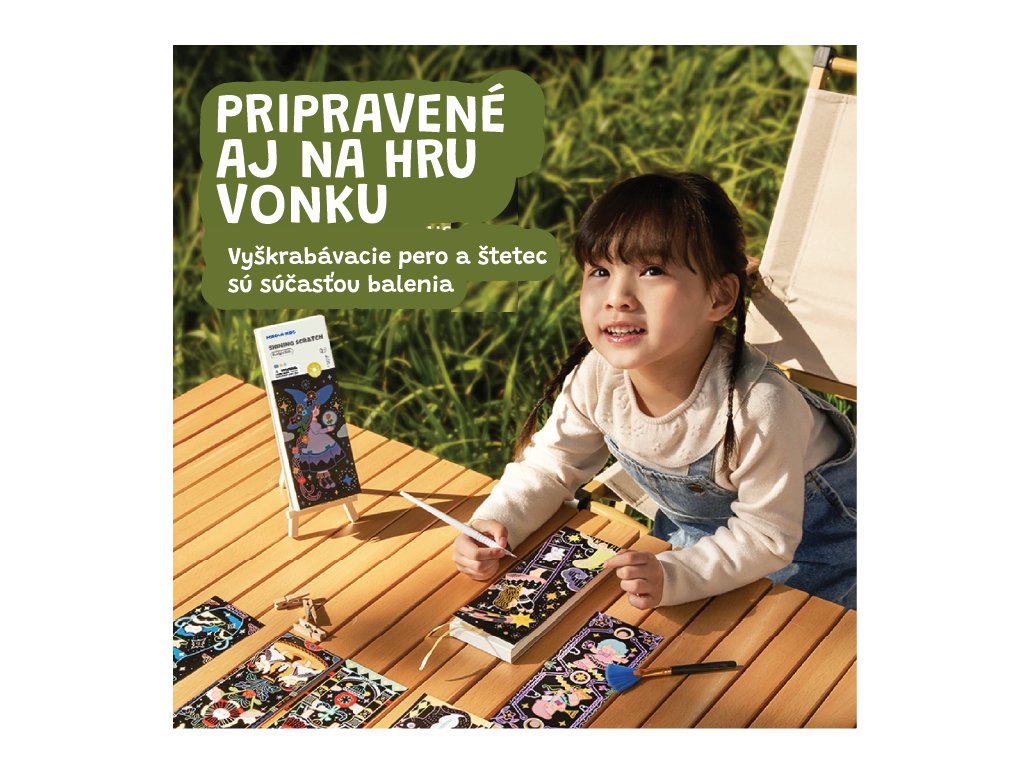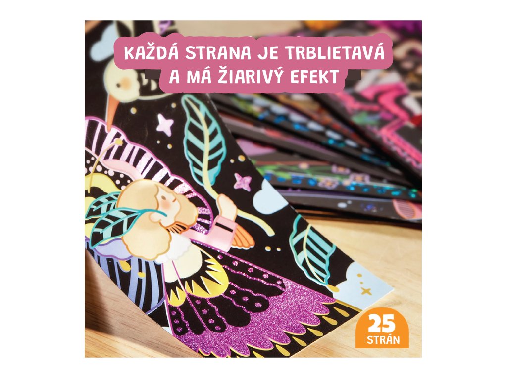 Trblietavé vyškrabávanie Starlight Girls Objavte svet trblietok ukrytý pod čiernou oblohou Sada vyškrabávacích obrázkov Starlight Girls od Jarmelo je ako nočné nebo plné tajomstiev. Pod čiernou vrstvou sa ukrývajú žiarivé trblietavé vzory, ktoré deti odhalia špeciálnym dreveným špáratkom. Perfektná aktivita na rozvoj jemnej motoriky, sústredenia a tvorivej fantázie – navyše bez neporiadku!Prečo si ju deti zamilujú? 25 vyškrabávacích strán s témou „hviezdne dievčatá“ a žiarivým trblietavým podkladom2 škrabadlá + štetec na jemné odstránenie zvyškovJednoduchá a čistá tvorba – bez farieb a lepidielRozvíja tvorivosť, koncentráciu a koordináciuKompaktný formát – ideálny aj na cesty či darček
