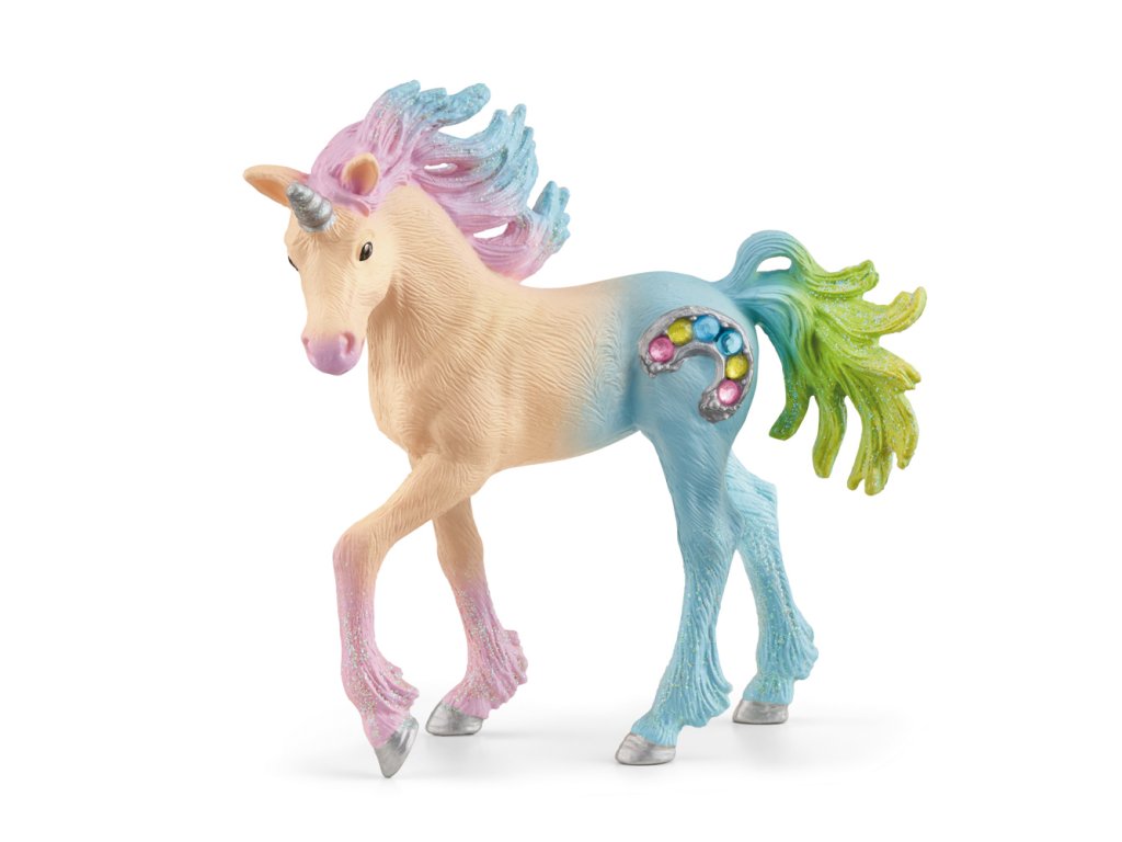 Magický svet bayala® sa len tak hemží pestrými stvoreniami. Naše cukríkové žriebä jednorožca zo sveta Schleich® bayala® je ale na farebnej škále najskôr úplne hore a do detskej izby nevnesie len farbu, ale aj radosť. Odkiaľ však žriebätá berú svoje rozmanité farby, doteraz zostáva záhadou. Možno na to prídete práve vy? Rozmer: 8,3 x 4 x 8,4 cm. Vek: 3+