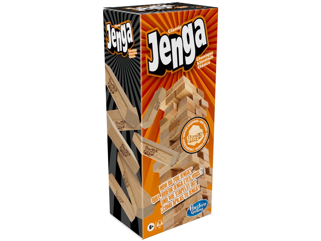 Hra Jenga je zábavná spoločenská hra pre 1 a viac hráčov, ktorí si chcú otestovať svoju trpezlivosť a šikovnosť. Hra začína postavením veže z 54 drevených kvádrov. Hráči sa potom striedajú vo vyťahovaní kvádrov, musia však byť opatrní, aby veža nespadla. Je dovolené používať iba jednu ruku a po vytiahnutí kvádra ho hráč položí späť na vežu. Musí vždy dokončiť jedno poschodie, než sa začne stavať nové. Komu veža spadne, prehráva. Hra pomáha v budúvaní trpezlivosti a zabavíte s ňou celú rodinu. Rozmer balenia: 28 x 11,5 x 8 cm. Vhodné od 6 rokov.