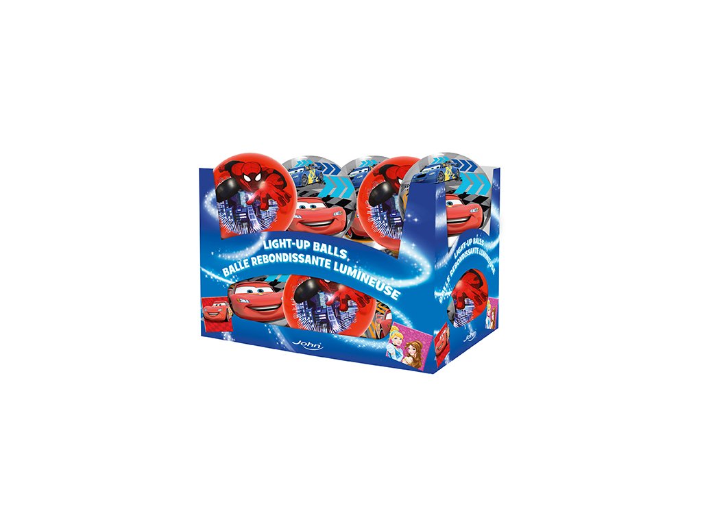 Detská kvalitná lopta z PVC v licencii Cars a Spider-Man. Loptička s priemerom 10 cm. Balené v displeji alebo samostatne. V displeji sú dva druhy. Lopta po hodení na zem alebo buchnutií svieti. Odporučený vek 3+