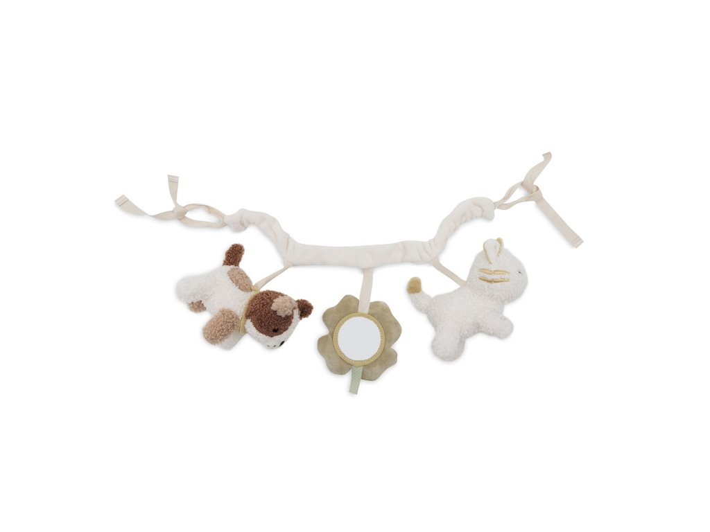 Reťaz na kočík či autosedačku so zavesenými hračkami v podobe psíka, mačičky a štvorlístka s bezpečným zrkadlom zabaví vaše bábätko v kočíku či autosedačke. Mäkké hračky vyrobené z jemného plyšu cinkajú a ponúkajú rôzne textúry na skúmanie. Hračky stimulujú koordináciu ruka/oko dieťaťa.