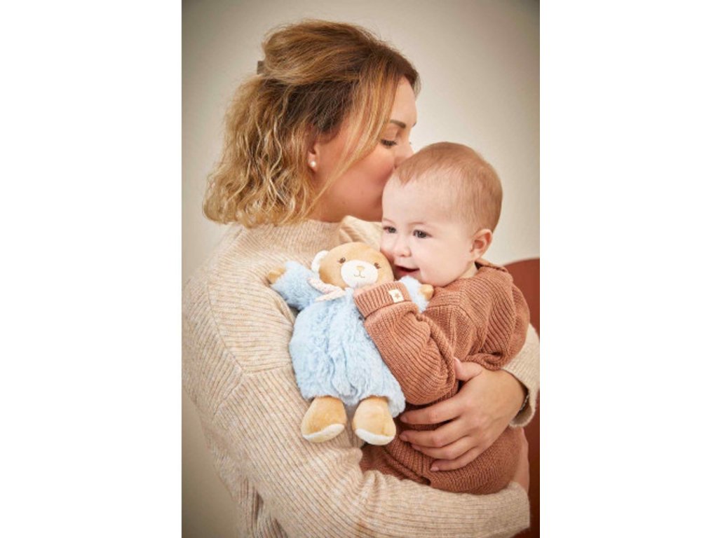 Tento modrý plyšový medvedík Patapouf sa dá prať v práčke pri teplote 30 °C.