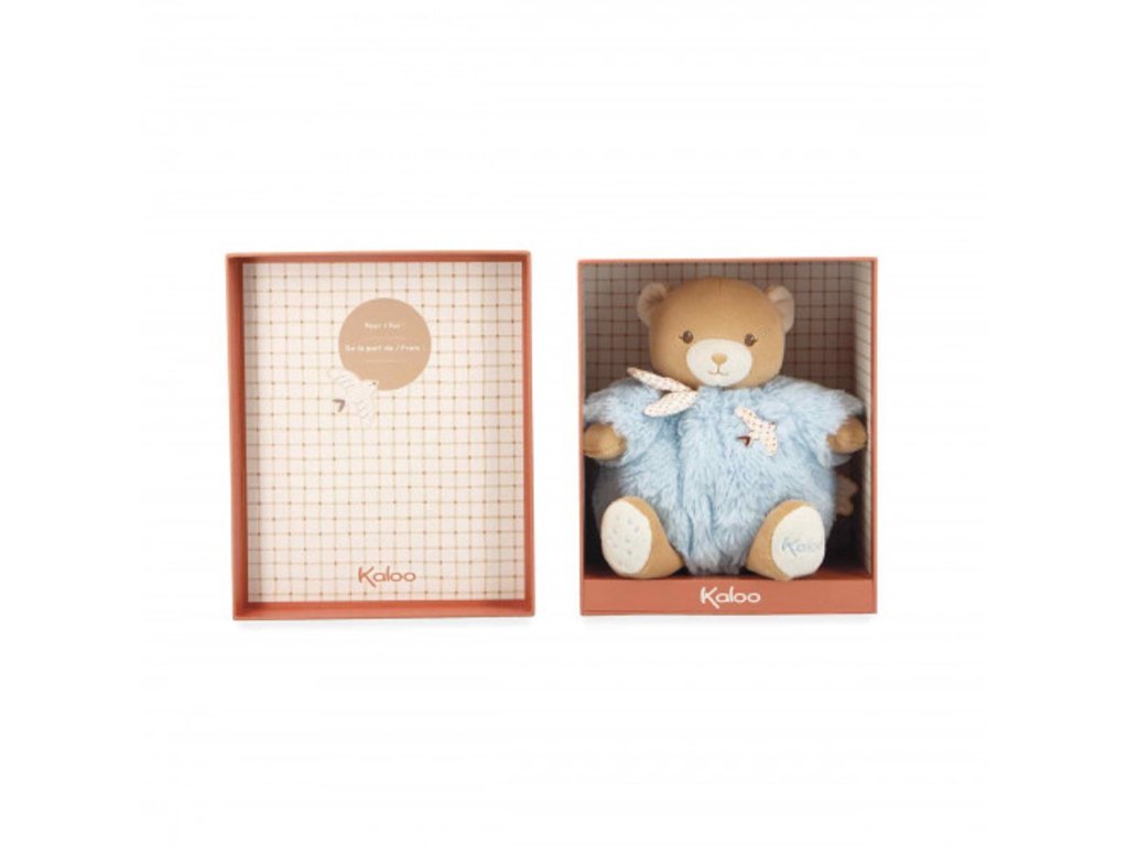 Tento modrý plyšový medvedík sa dodáva v krásnej zodpovedajúcej darčekovej krabičke, ktorú je možné prispôsobiť vďaka vložke pod vekom.