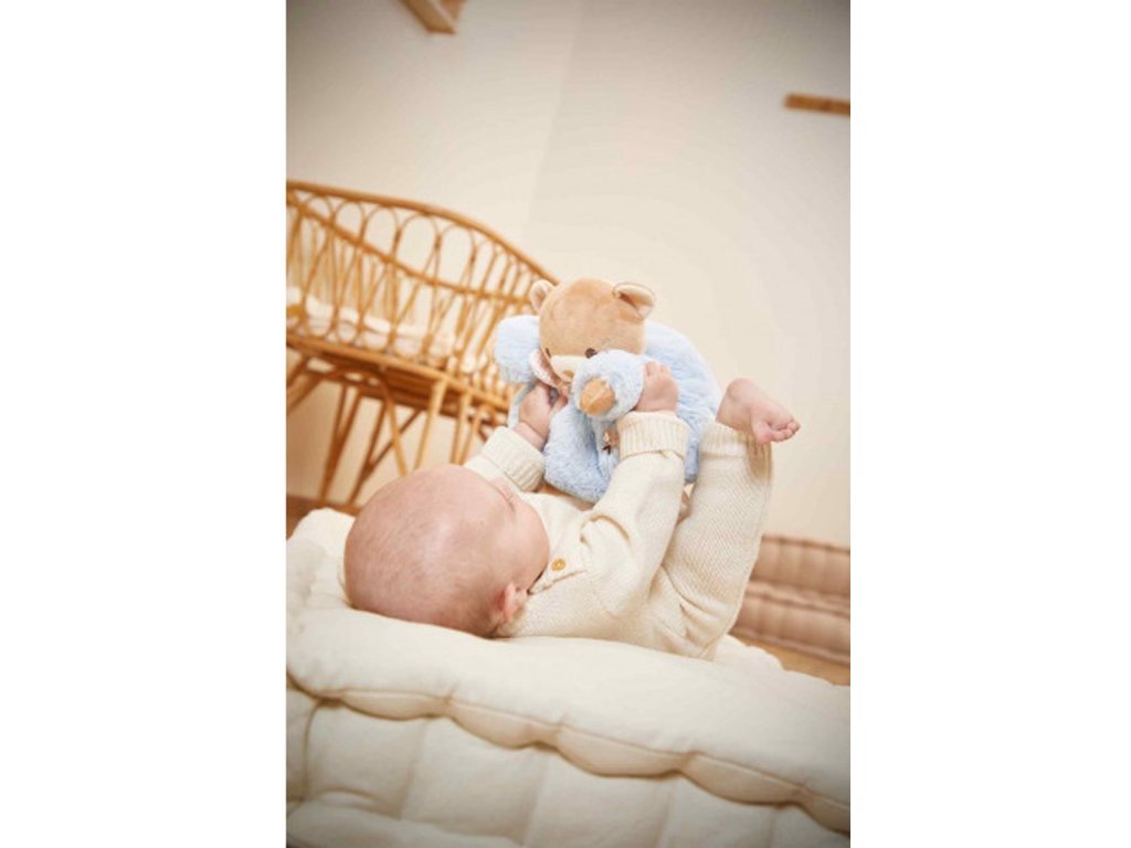 Tento modrý plyšový medvedík Patapouf sa dá prať v práčke pri teplote 30 °C.