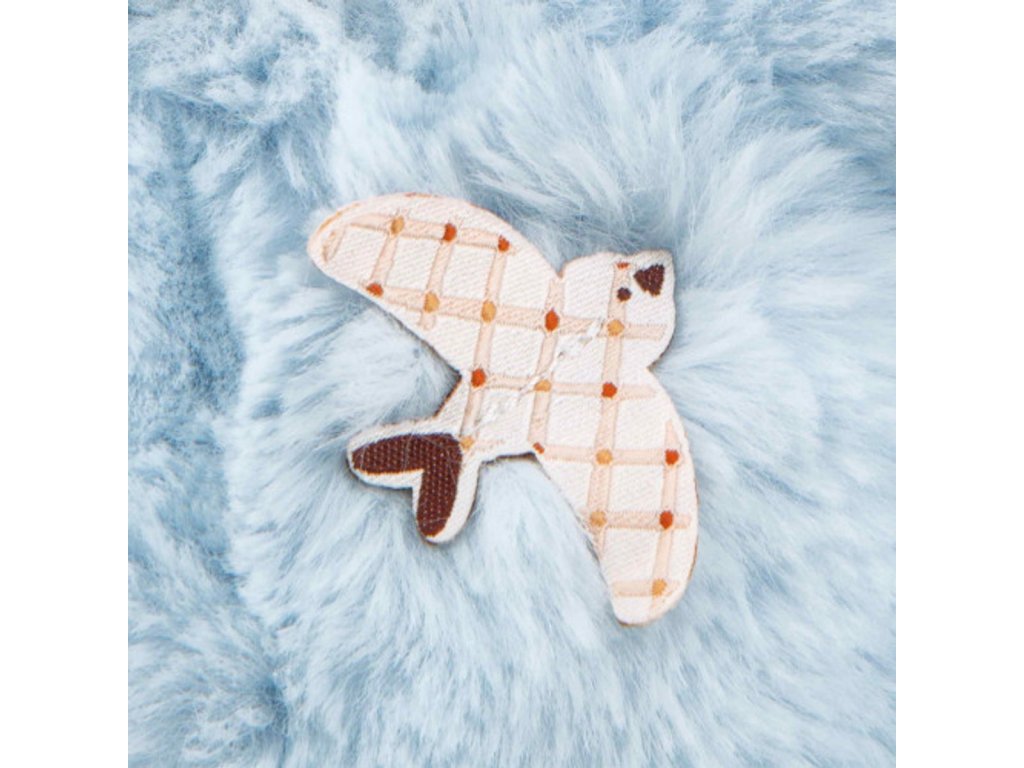 Modrý Patapouf je ozdobený detailmi, ktoré mu dodávajú rozhodne nadčasový štýl: lastovička, synonymum obnovy a sviežosti, výšivka príjemná na dotyk, pekná kockovaná potlač na srdiečku a zodpovedajúce stuhy okolo krku.