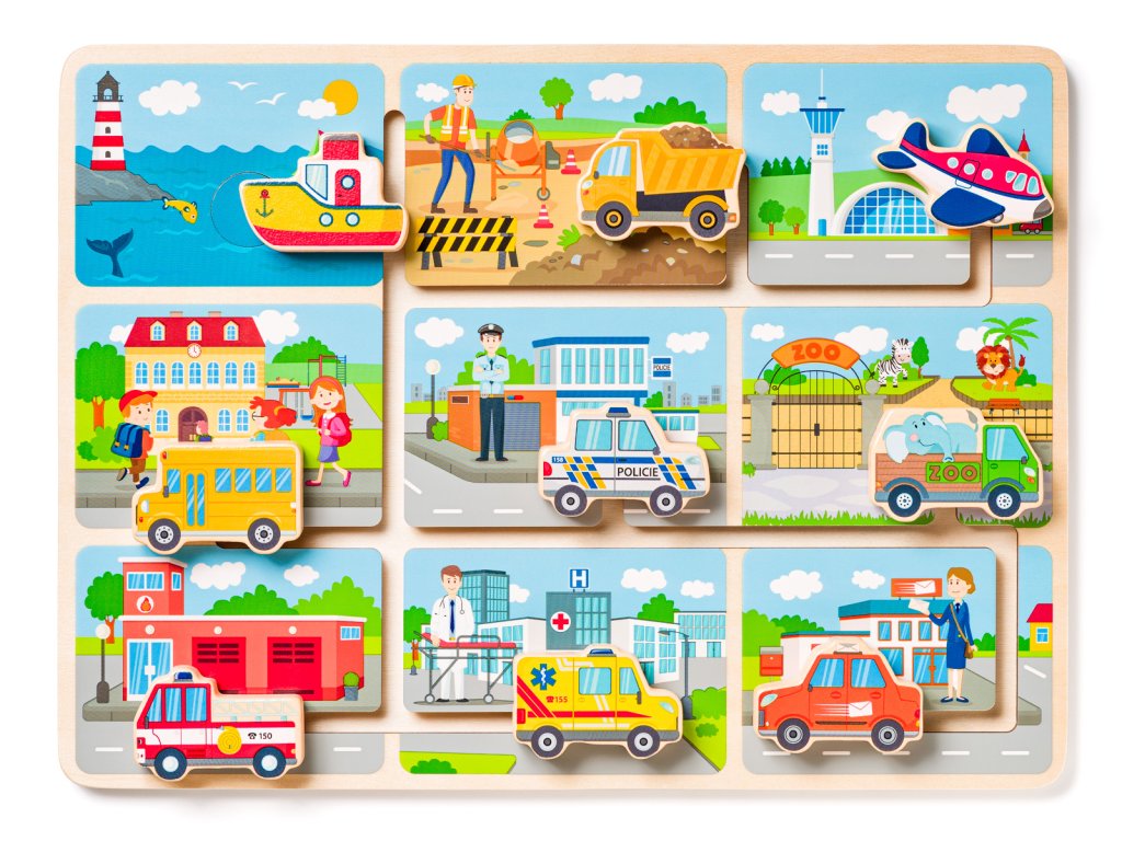 Úlohou dieťaťa je umiestniť dopravné prostriedky do prostredia, do ktorého patrí: loď na more, hasičské auto pred hasičskú stanicu, nákladné auto na stavenisko atď. Cestou sa musí vyhýbať ostatným autíčkam a nájsť si tú správnu cestu k svojmu cieľu. | Vek: 1+ | Rozmer: 30 x 22 x 1,5 cm.