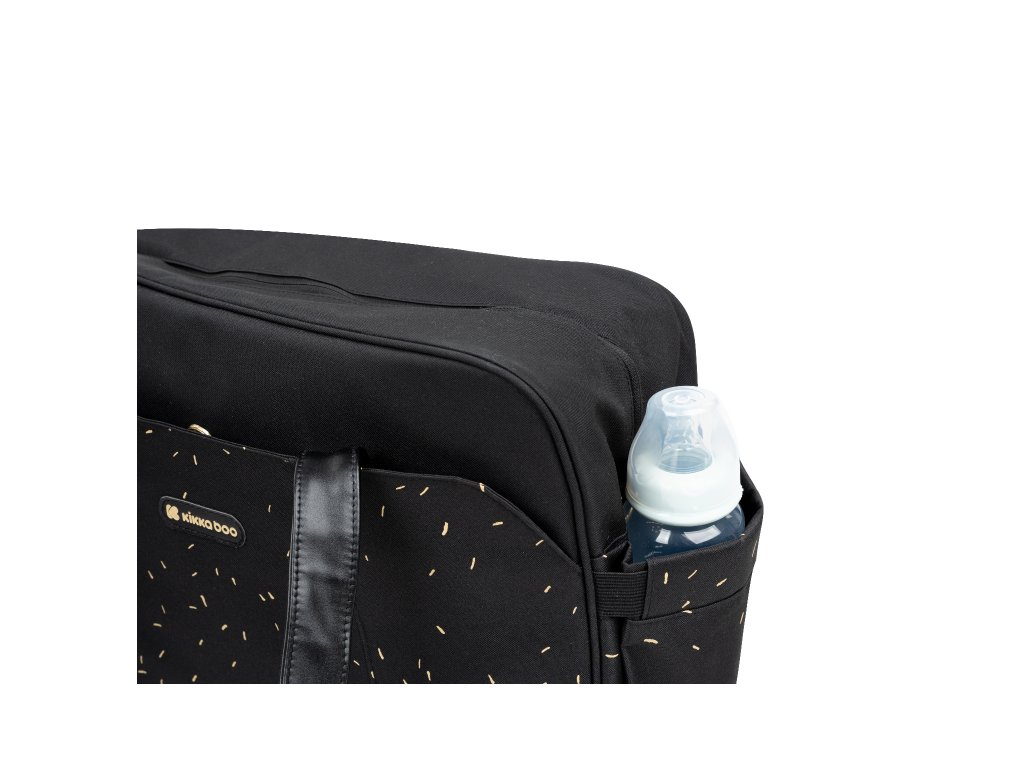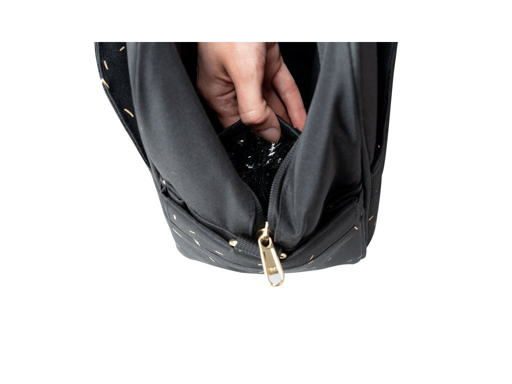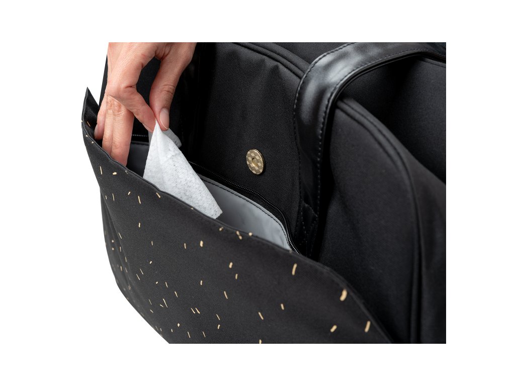 Vnútri tašky nájdete prebaľovaciu podložku, množstvo vreciek a priehradok, vodeodolné vrecko na uloženie vlhkých predmetov a dve termoizolačné vrecká na fľaše. Na vonkajšej strane nájdete vrecko na zips aj priestor na uloženie fľaše.