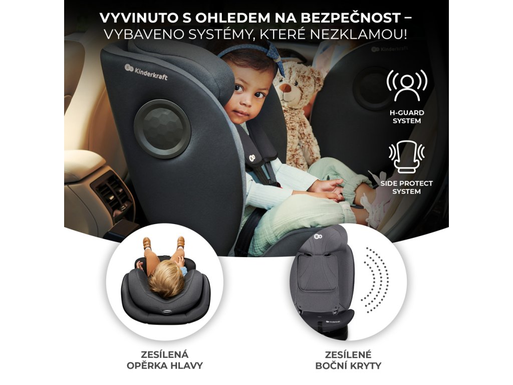 Detská autosedačka I-360 má dva bezpečnostné systémy, ktorých úlohou je ešte lepšia ochrana dieťaťa počas cestovania. H-GUARD SYSTEM je vystužená, 3-vrstvová opierka hlavy s pamäťovou penou, absorbujúca silu nárazu, ktorá vzniká pri nárazoch. Avšak škrupina detskej sedačky je vystužená širokými, vysokými bočnými chráničmi, ktoré absorbujú sily vznikajúce pri bočných nárazoch (SIDE PROTECT SYSTEM +).