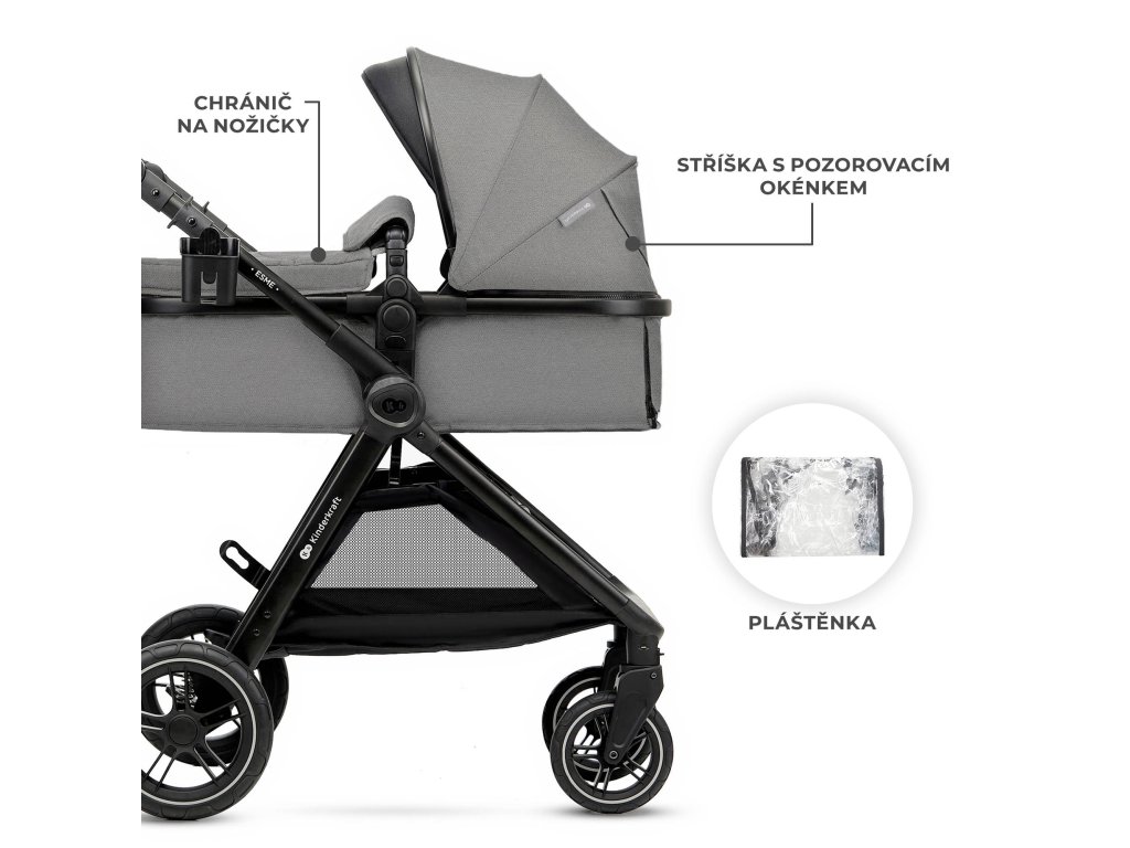 Kočík 3 v 1 ESME má veľkú striešku s okienkom pre kontakt s dieťaťom, ktorá chráni pred vetrom aj slnkom. Pod sedadlom sa nachádza priestranný košík s nosnosťou až 3 kg – ideálny na nákupy alebo nevyhnutné doplnky. O bezpečnosť dieťaťa sa starajú nastaviteľné 5-bodové pásy s mäkkými polstrami a odnímateľné madlo, ktoré možno otvoriť z oboch strán.