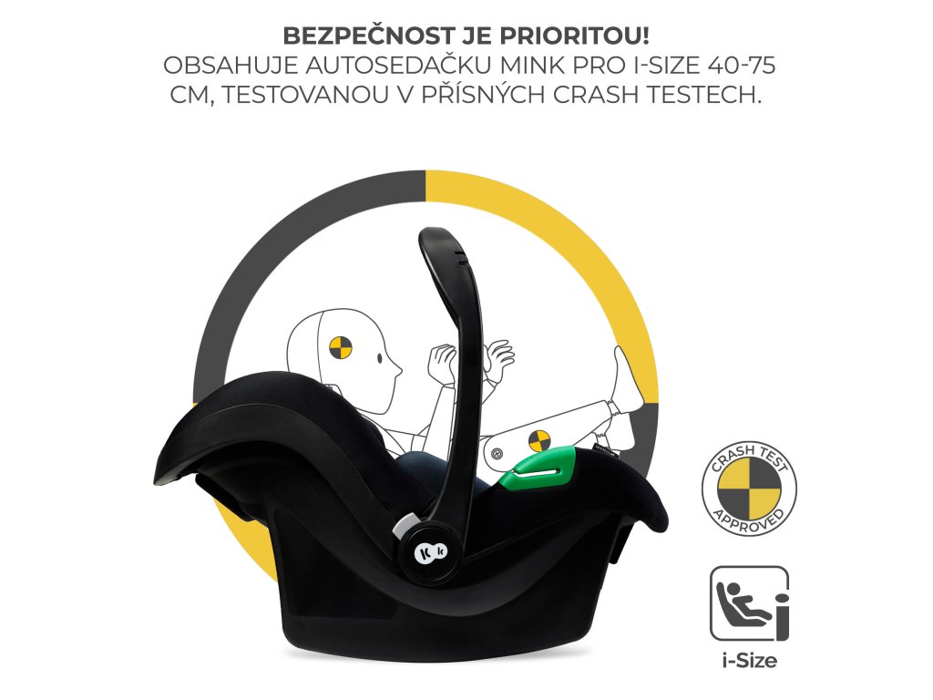 Súčasťou balenia je autosedačka MINK PRO 2 i-Size (40–87 cm) s adaptérmi, ktoré umožňujú vytvoriť cestovný systém (TRAVEL SYSTEM). Okrem toho získate držiak na pohár, univerzálny nánožník, pláštenku a tašku na rukoväť.