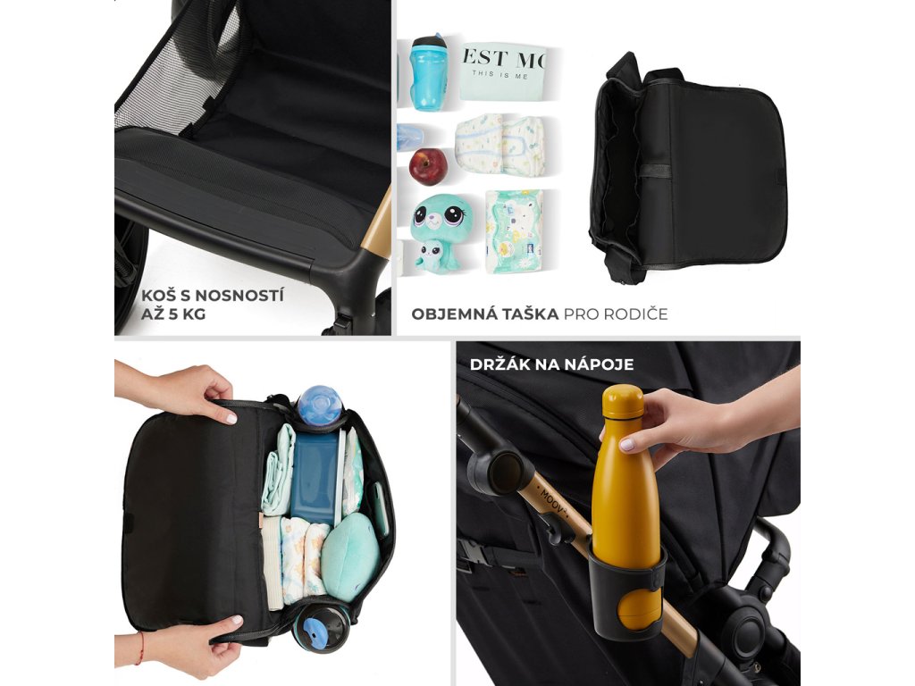 Kompletná sada príslušenstva: kočík MOOV 2 XL obsahuje všetko potrebné na pohodlnú prechádzku: držiak na nápoje, univerzálny kryt na nohy (na vaničku aj kočík), moskytiéru, pláštenku, tašku pre rodičov a adaptéry na autosedačku.